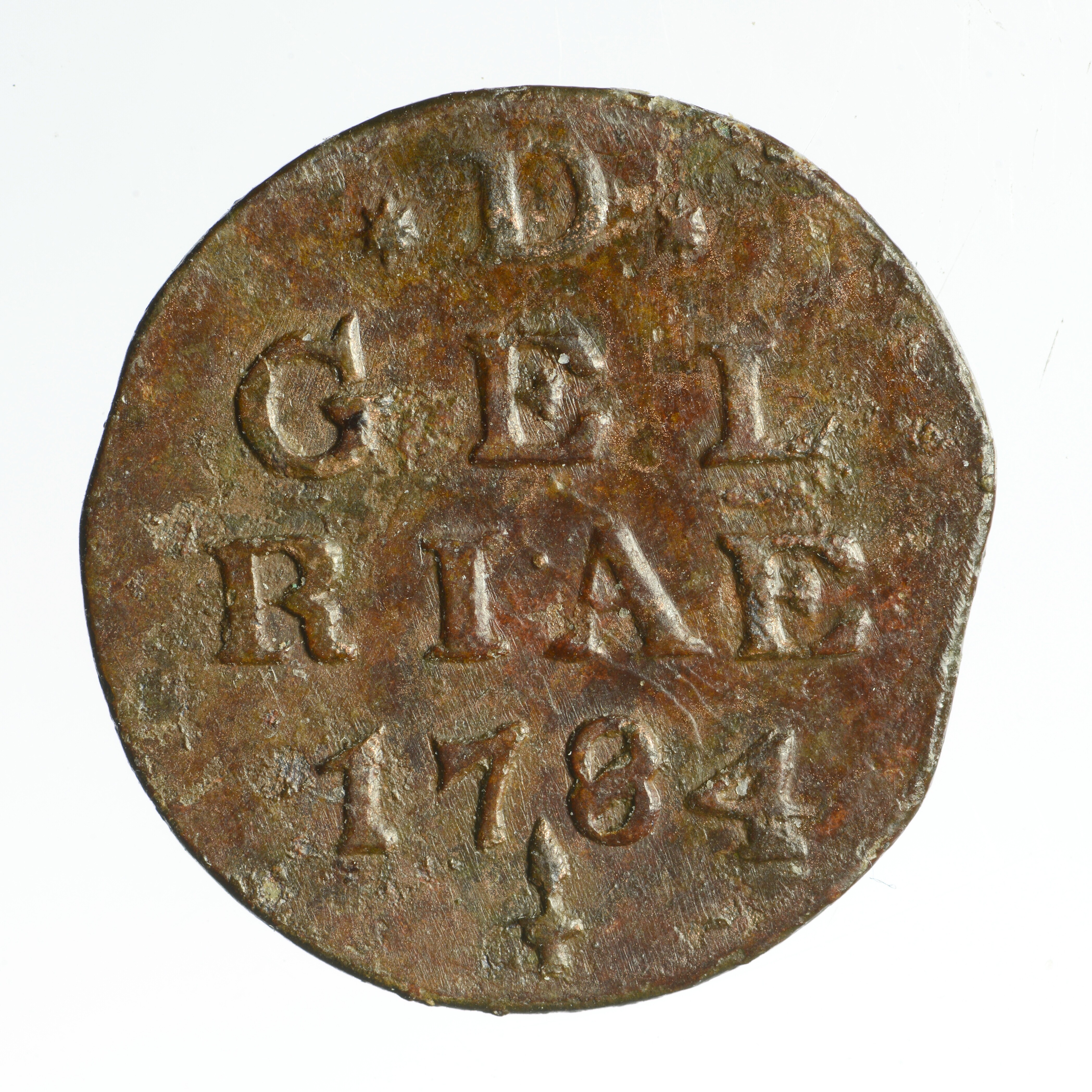 Duit; Provincie Gelderland (1581-1795); vz.: in vier regels: *D* / GEL / RIAE / 17844 en muntmeesterteken: korenaar; kz.: gekroond wapen van Gelderland, omschrift: IN DEO EST SPES NOSTRA; gewicht: 2.93 gram