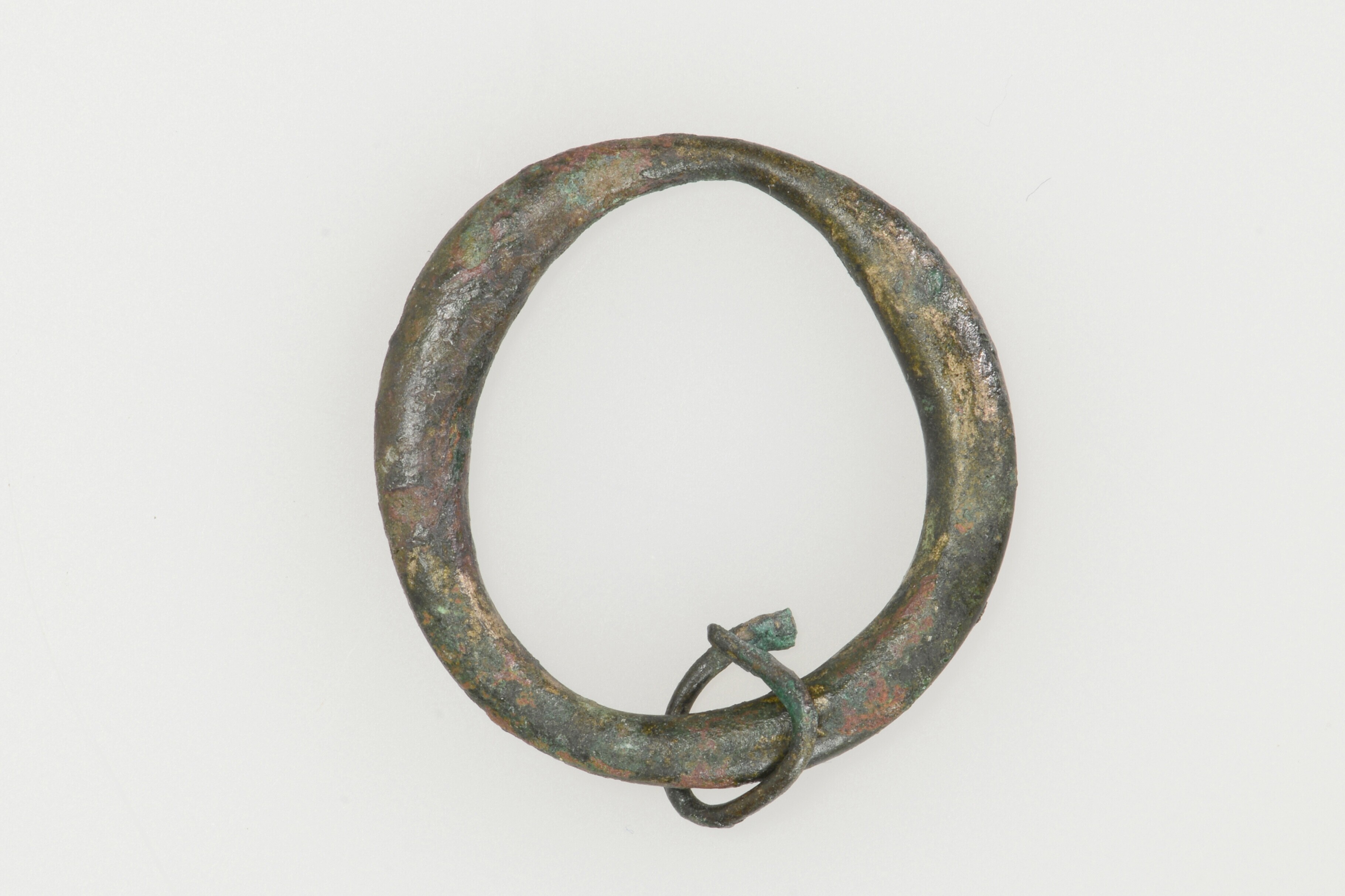 Ringen; grote ring met slijtage door gebruik; daaraan een kleine dunne ring. Mogelijk onderdeel van een halssnoer/halsketting