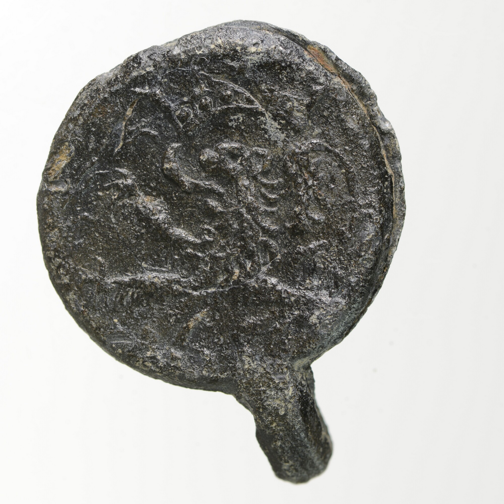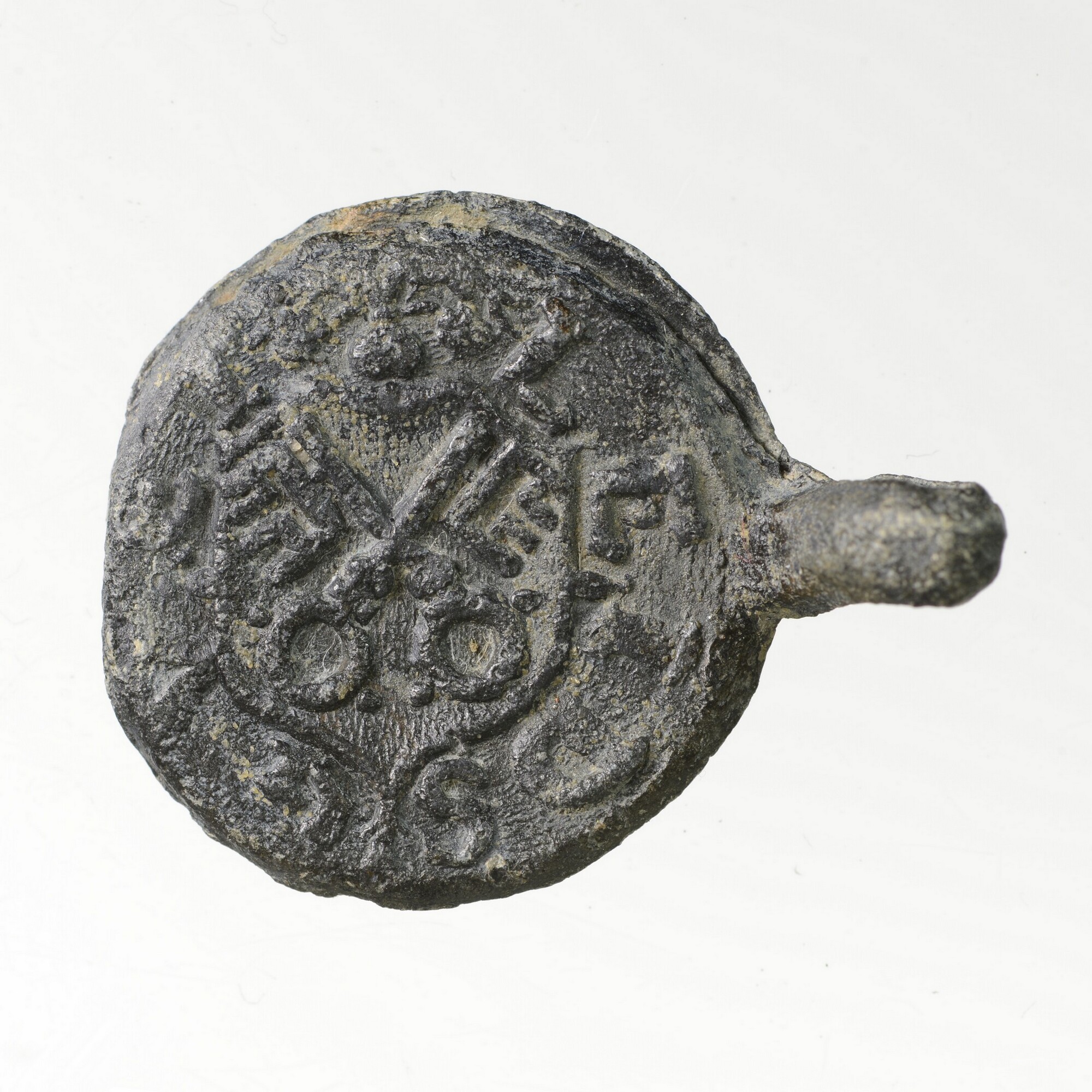 Textiellood; saailood Leiden, zonder klop, stadswapen type II, provinciewapen type III; beeldenaren: gekruiste sleutels = stadswapen van Leiden / gekroonde klimmende leeuw = wapen graafschap Holland; leesbare tekst: LEIDS GVET / 16 (staat voor: LEIDS GVET = Leids goed / 1635); gewicht: 15 gram