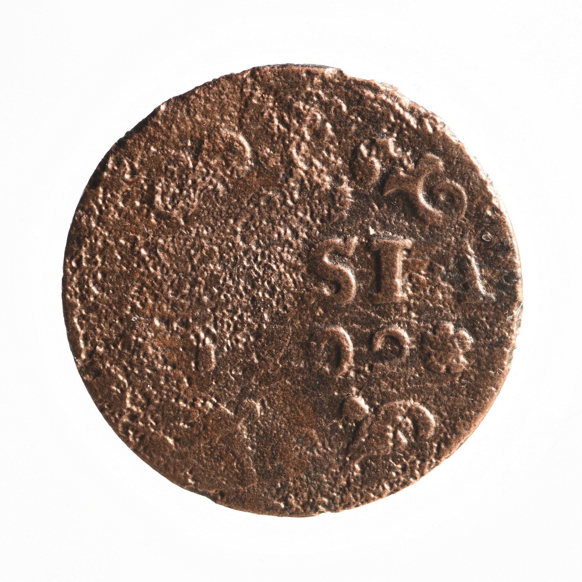Duit; Friesland Provincie (1581-1795); vz.: in vier regels: muntteken klimmende leeuw tussen twee bladornamenten / [FRI]SIA / (rozet) 1702 (rozet) / bladornament (rozet) bladornament; kz.: met open kroon gekroond wapenschild van Friesland met ter weerszijden naar boven krullende bladornamenten; muntplaats: Leeuwarden; gewicht: 2.44 gram.