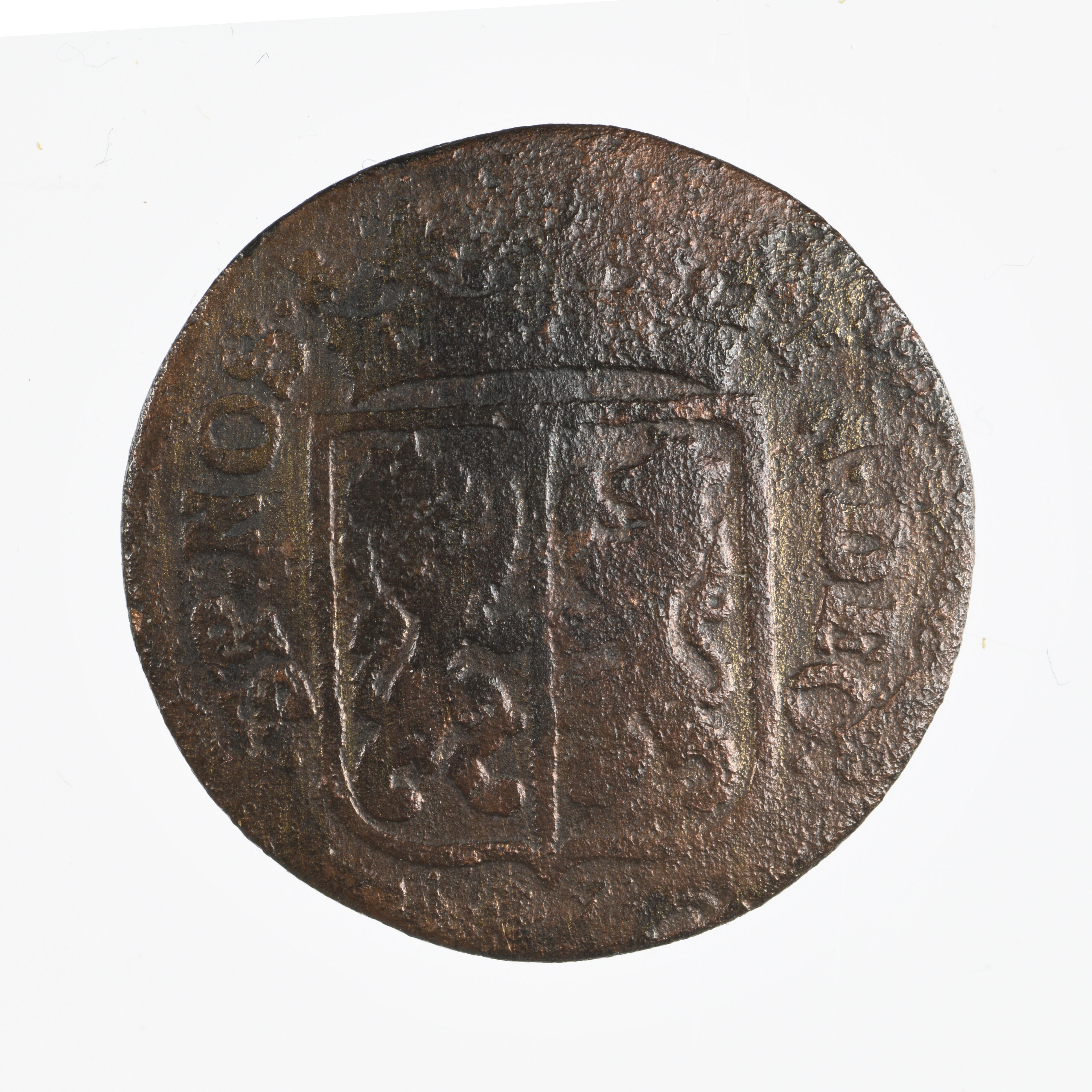 Duit; Gelderland Provincie (1581-1795); vz.: in vier regels: •D• / GEL / RIÆ / •1703[•]; kz.: gekroond wapen van Gelderland, omschrift: IN•DEO •SP•NOS•; gewicht: 3.04 gram