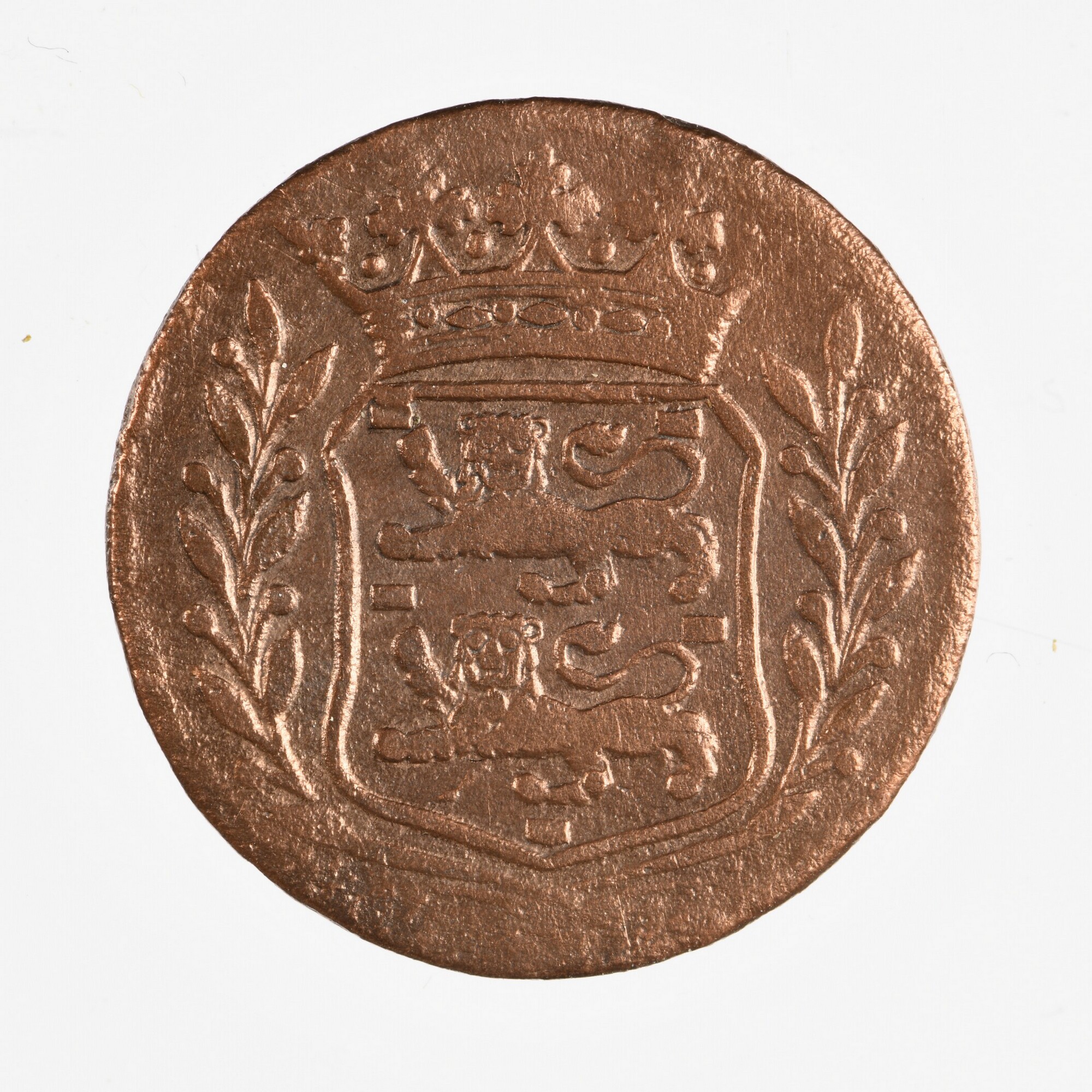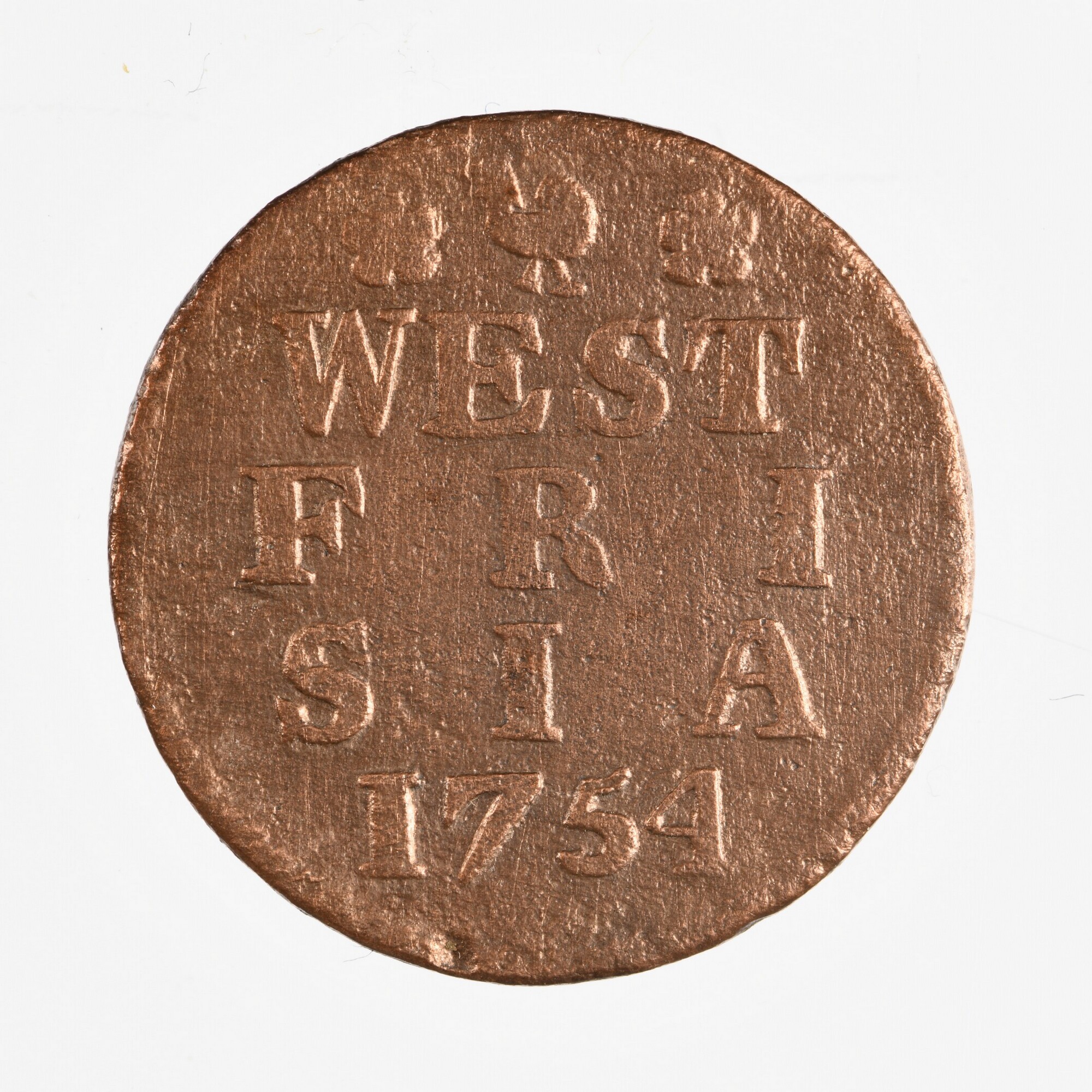 Duit; West-Friesland; vz.: muntmeesterteken haan tussen twee rozetten met daaronder in vier regels: WEST / FRI / SIA / 1754; kz.: gekroond wapen van West-Friesland binnen bladerkrans; gewicht: 2.95 gram