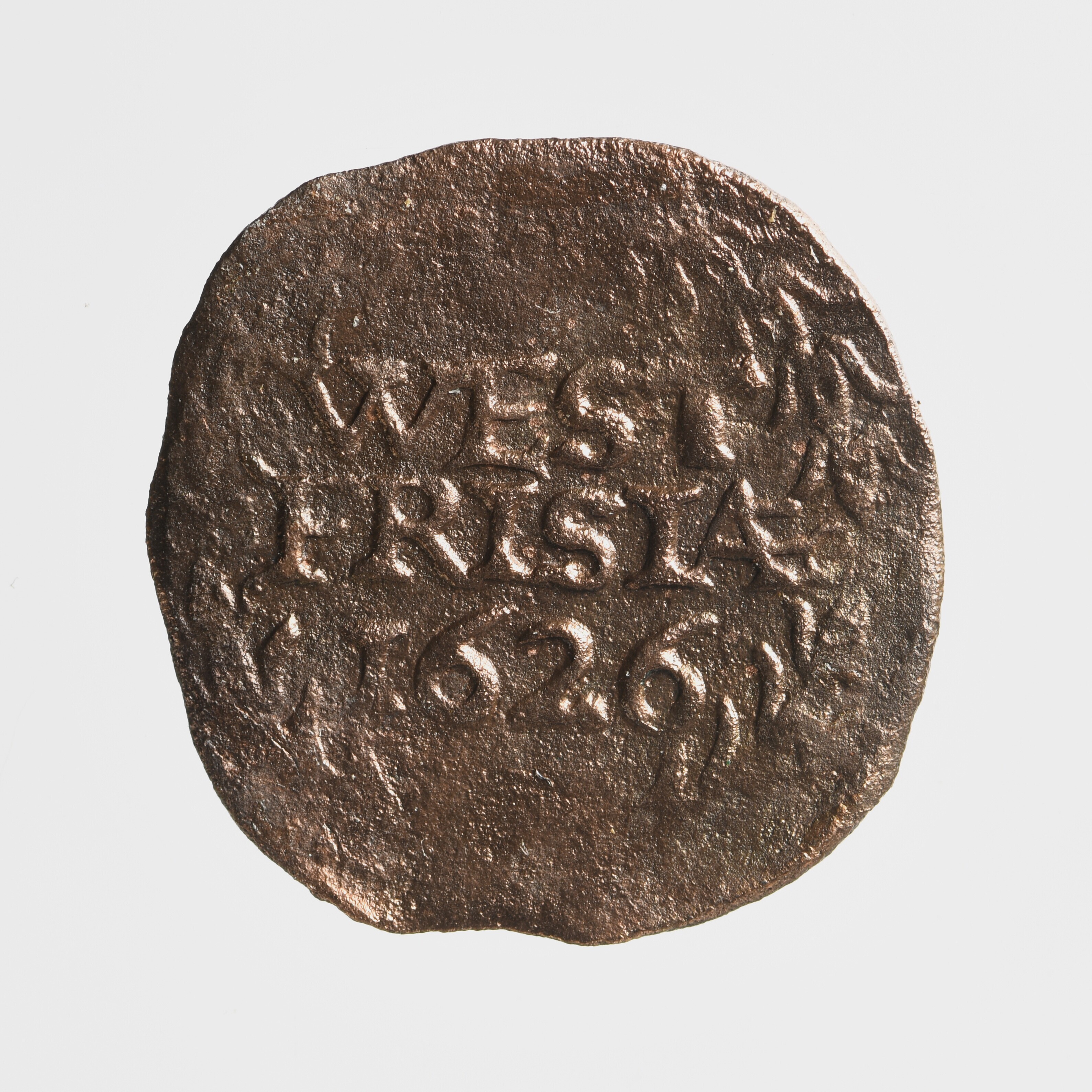 Duit; West-Friesland; vz.: binnen een tulpkrans opschrift in drie regels WEST / FRISIÆ / 1626; kz.: gekroond en versierd wapenschild van West-Friesland met omschrift DEVS F[ORTI•ET•S]P•NOS; muntplaats: Enkhuizen; gewicht: 1.80 gram
