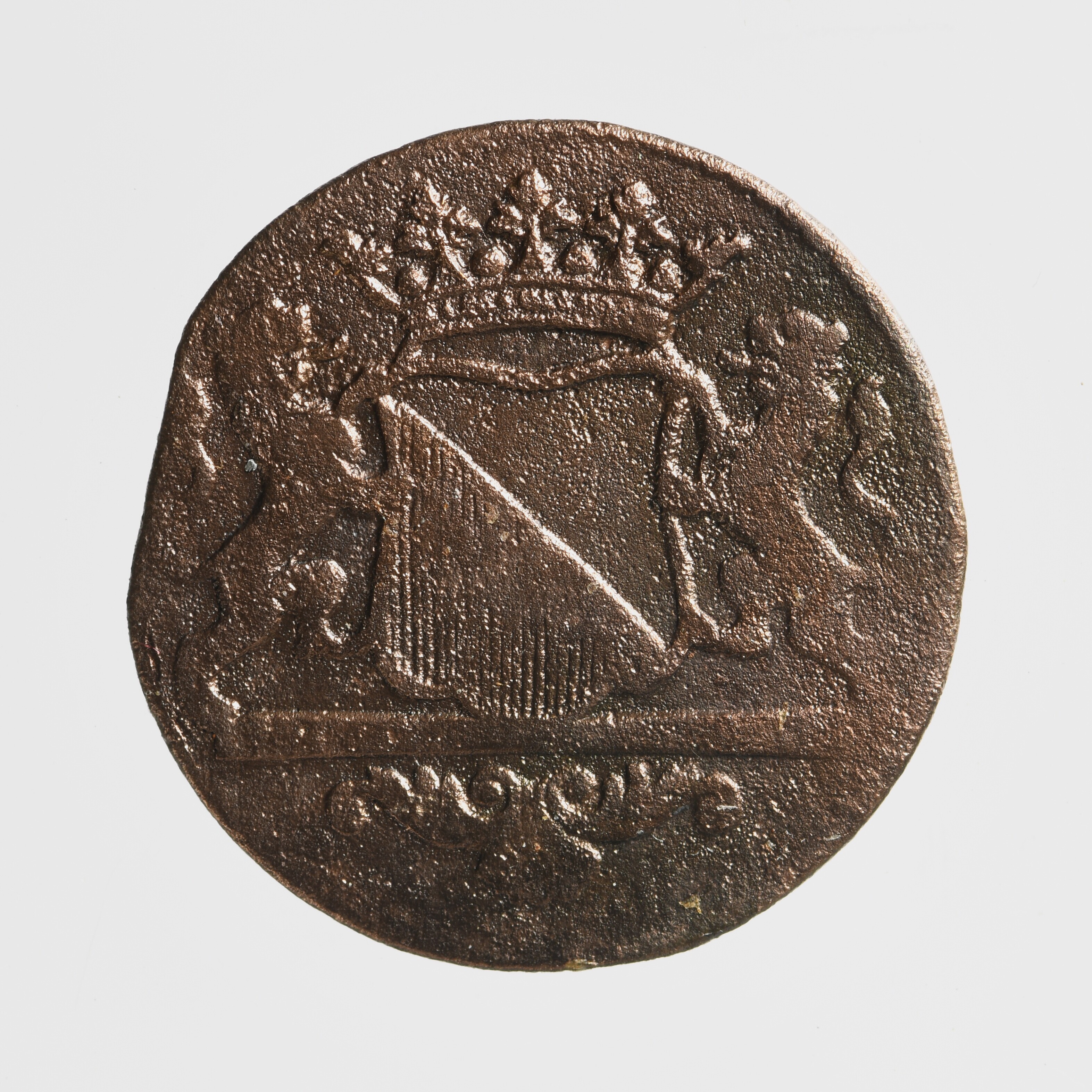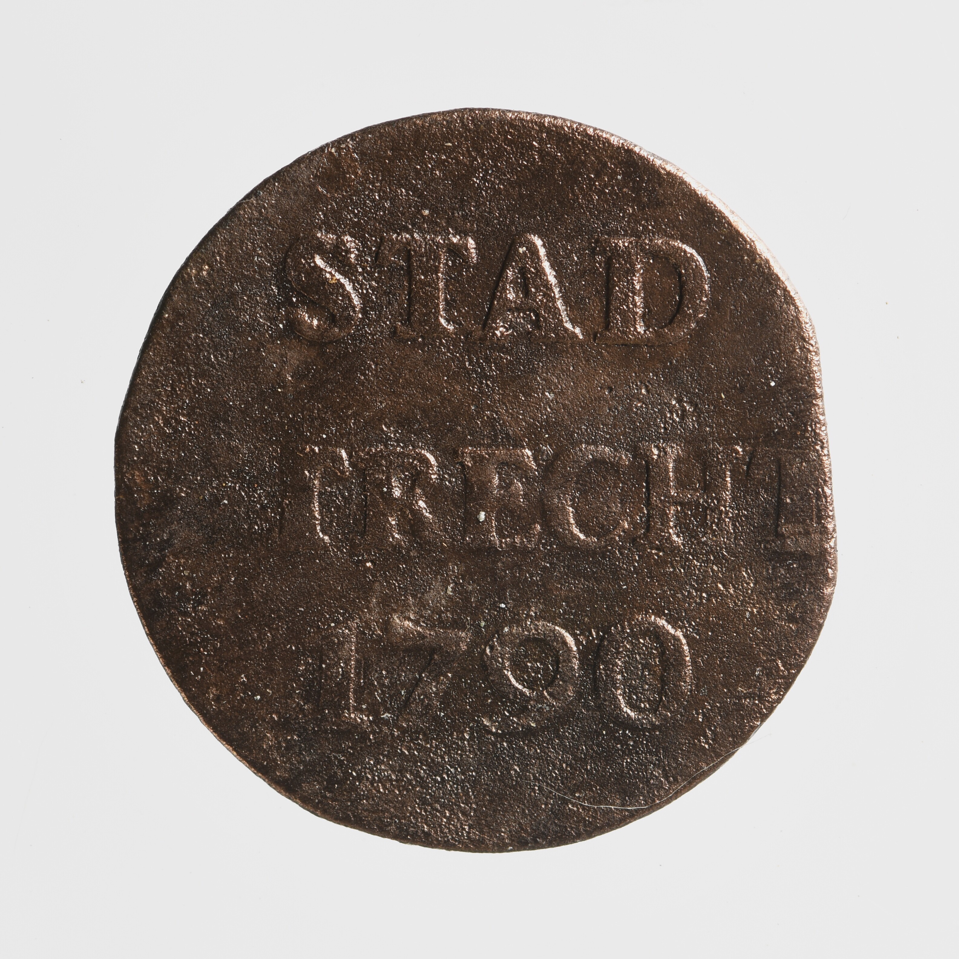 Duit; Utrecht Stad (1581-1795); vz.: in drie regels: STAD / UTRECHT / 1790; kz.: gedamasceerd stedelijk wapenschild fijn gearceerd, gehouden door twee leeuwen, de afsnede bestaat uit een dubbele lijn, met hieronder een versierde accolade met een grote schelp; muntplaats: Utrecht; gewicht: 2.52 gram
