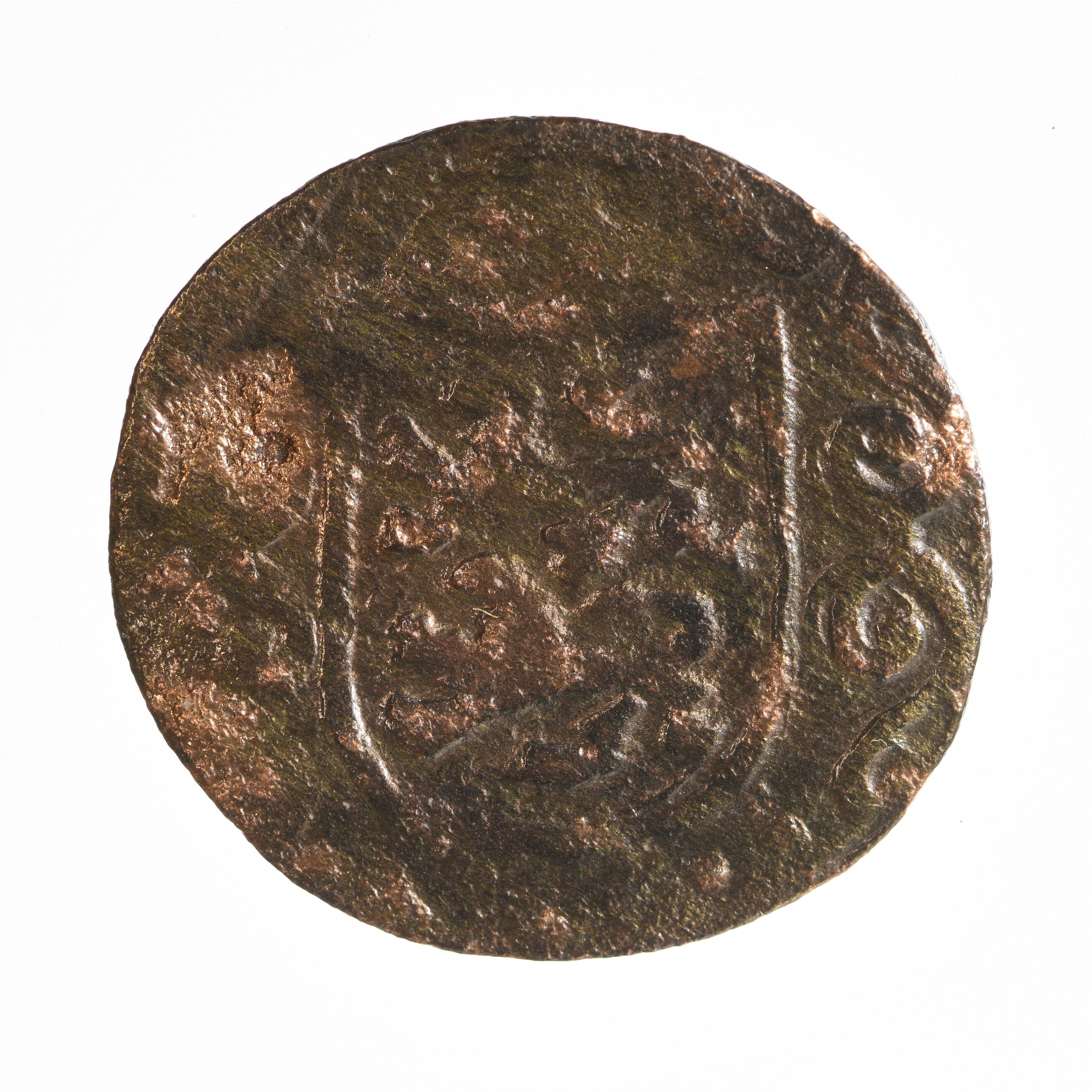 Duit; imitatie duit Friesland Provincie; Reckheim Baronie (1356-1623) of Rijksgraafschap (1623-1795); vz: binnen een bladerkrans in drie regels: •FRI / •CIR / •16[..]; kz.: versierd wapenschild met twee leeuwen, gelijkend op dat van Friesland; muntplaats: Reckheim; gewicht: 1.28 gram