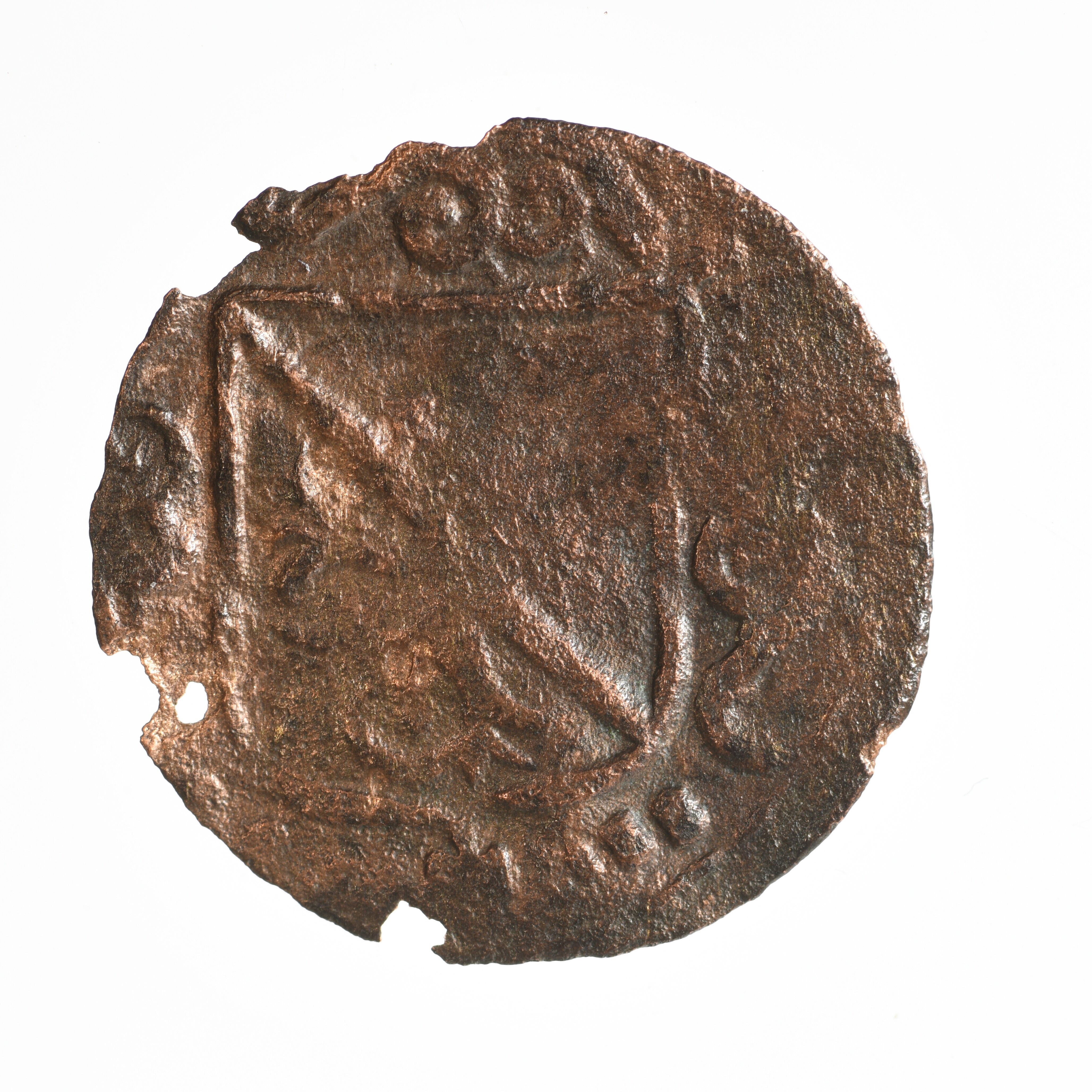 Duit; imitatie duit Utrecht Stadt; Reckheim Rijksgraafschap (1623-1795); vz.: binnen een bladerkrans in vijf regels: •• / TRAM / REC• / HEM• / ••• ; kz..: versierd wapenschild van Utrecht met vlamversiering; muntplaats: Reckheim; gewicht: 0.73 gram