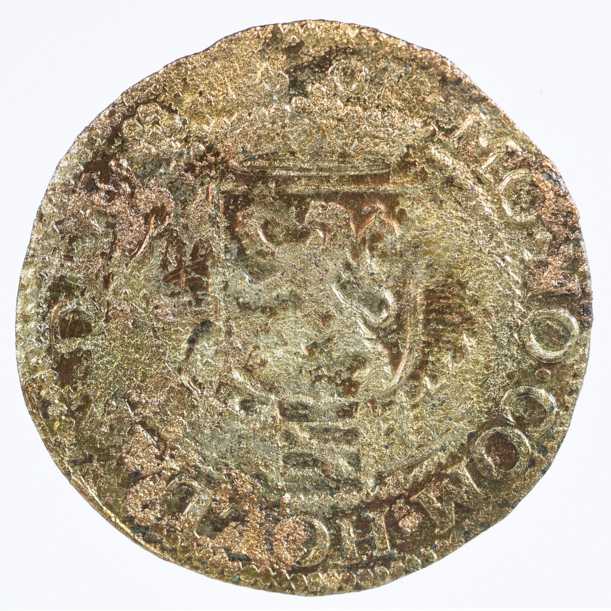Roosschelling; Holland Provincie (1581-1795); vz.: gekroond Hollands wapenschild binnen een gesloten Hollandse tuin met omschrift •MO•NO•COM•HOLLANDIÆ• (rozet) • 1601; kz.: lang gebloemd kruis met centrale rozet en Franse lelies, en omschrift VIGILA // TE•DEO // CONFID // ENTES•; gewicht: 4.75 gram