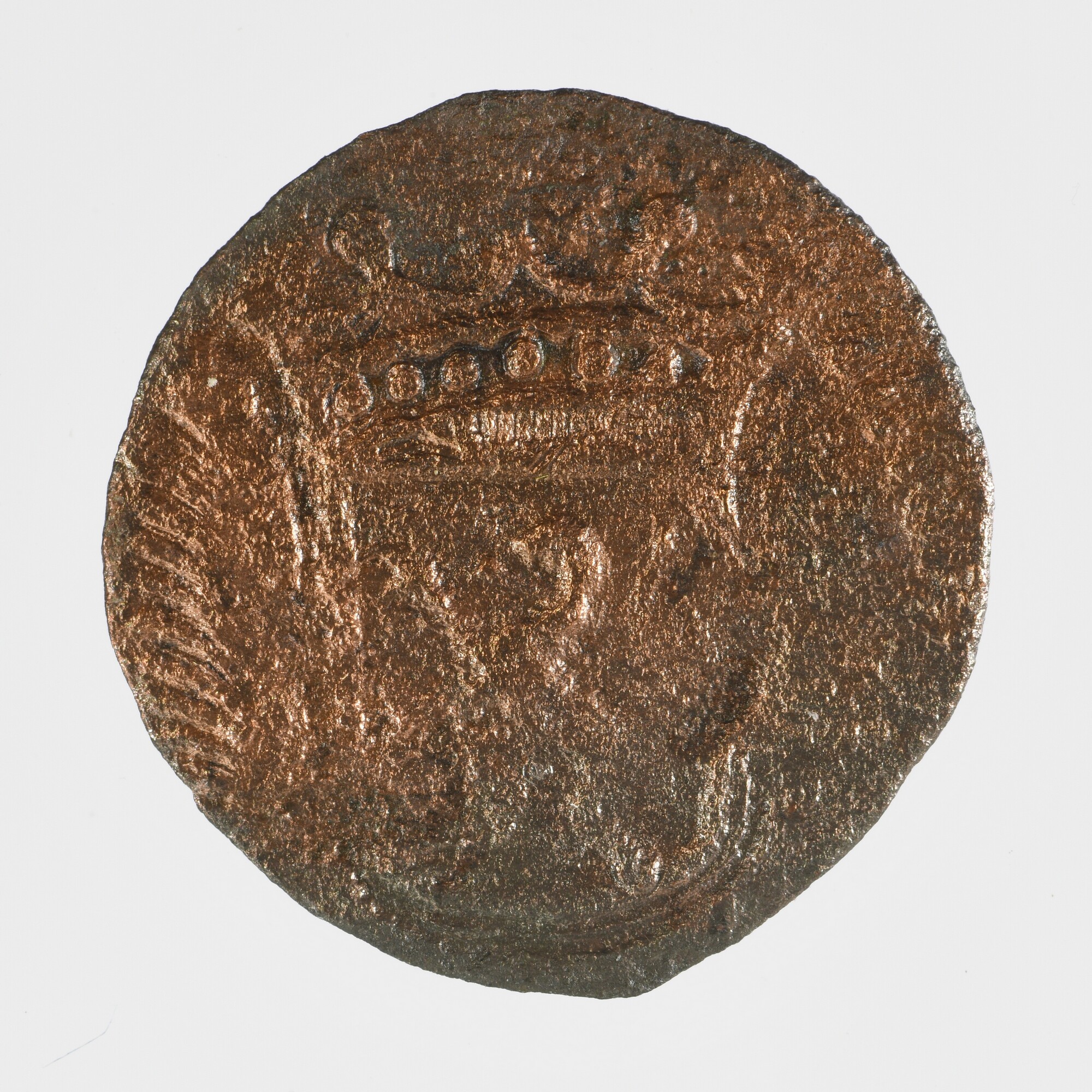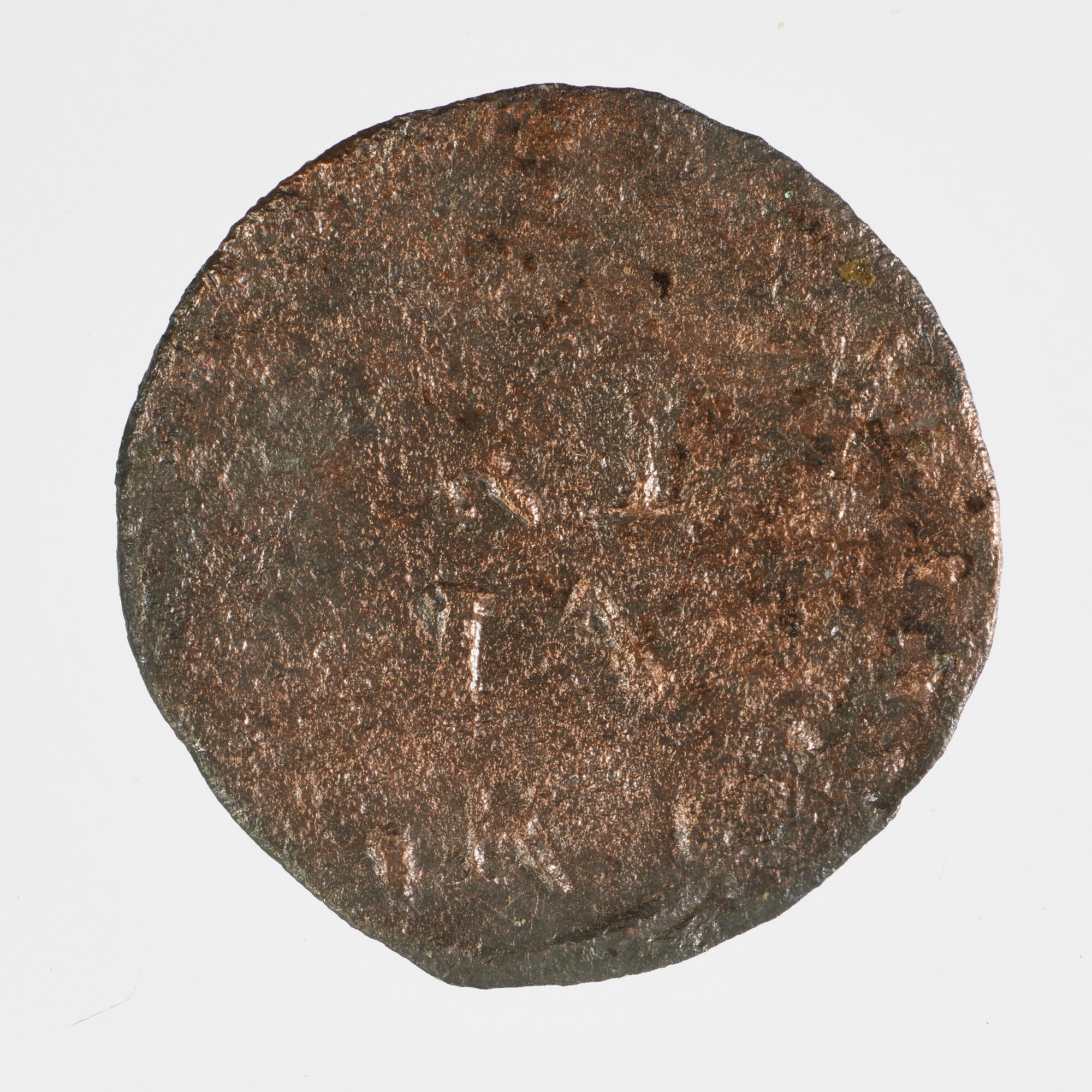 Duit; Rijksgraafschap (1623-1795); vz: binnen een bladerkrans in drie regels: [F]RI / [C]IA / R; kz.: gekroond wapenschild met leeuw binnen palmtakken; muntplaats: Reckheim; gewicht: 0.97 gram