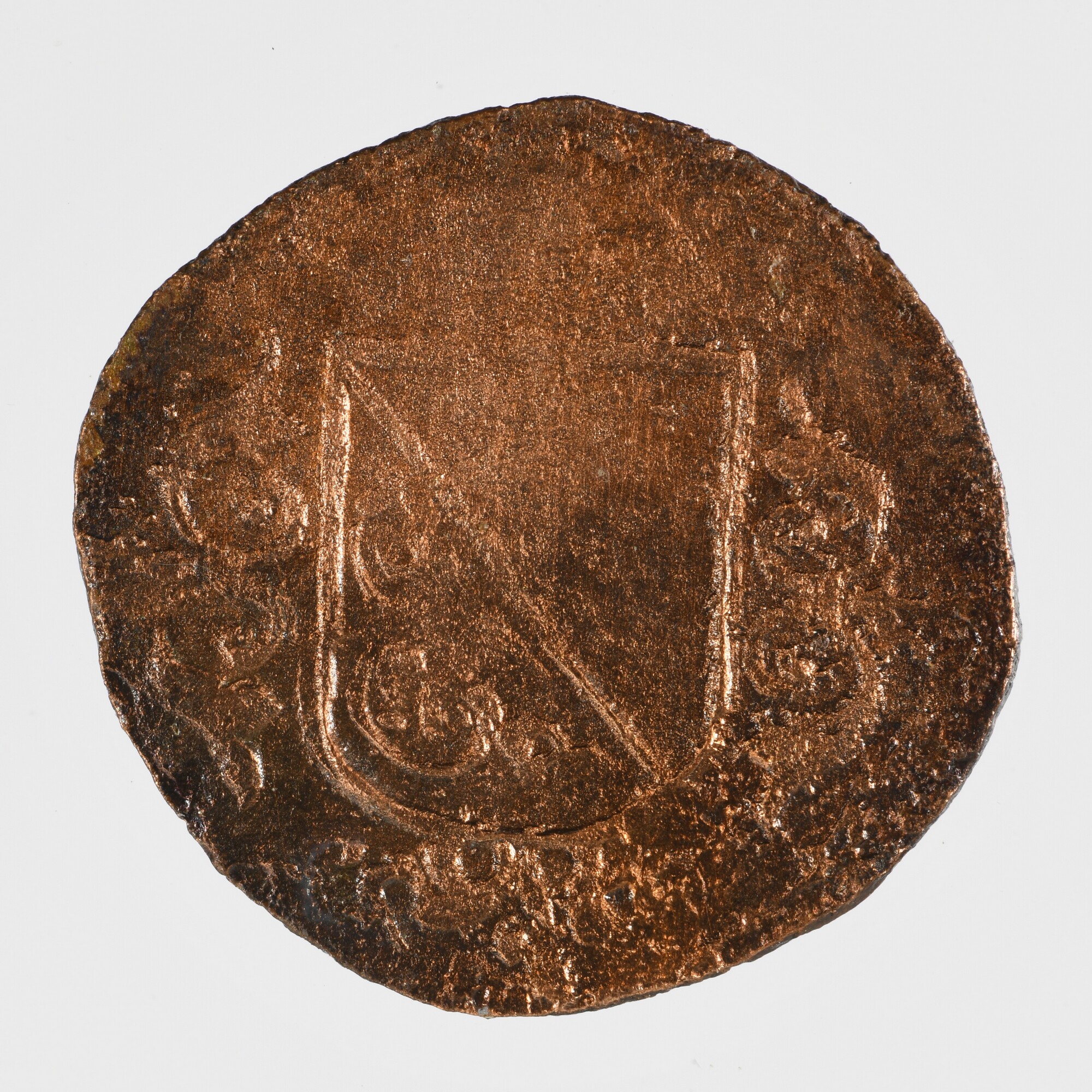 Duit; Utrecht Stad (1581-1795); vz.: binnen een tulpkrans opschrift in vier regels: TRA / IE[C] / TV[M] / 162[5]; kz.: gedamasceerd stedelijk wapenschild met rondom lelievormen; muntplaats: Utrecht; gewicht: 1.50 gram