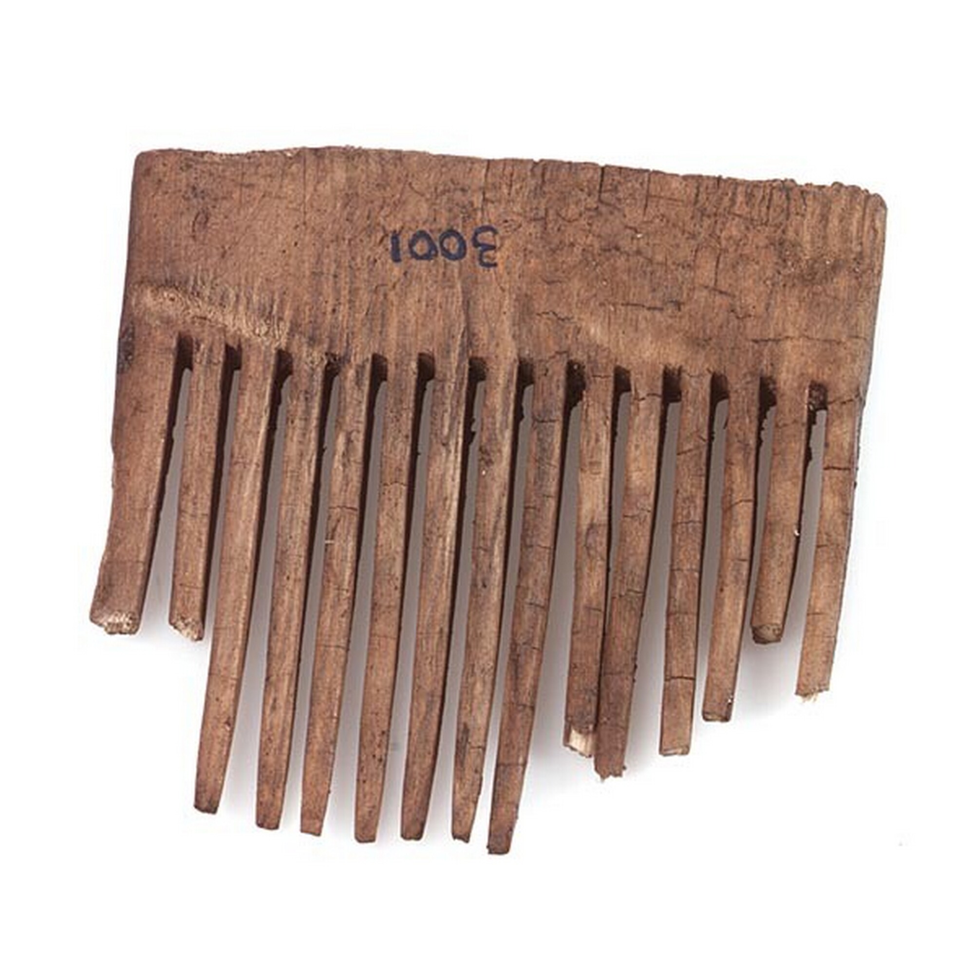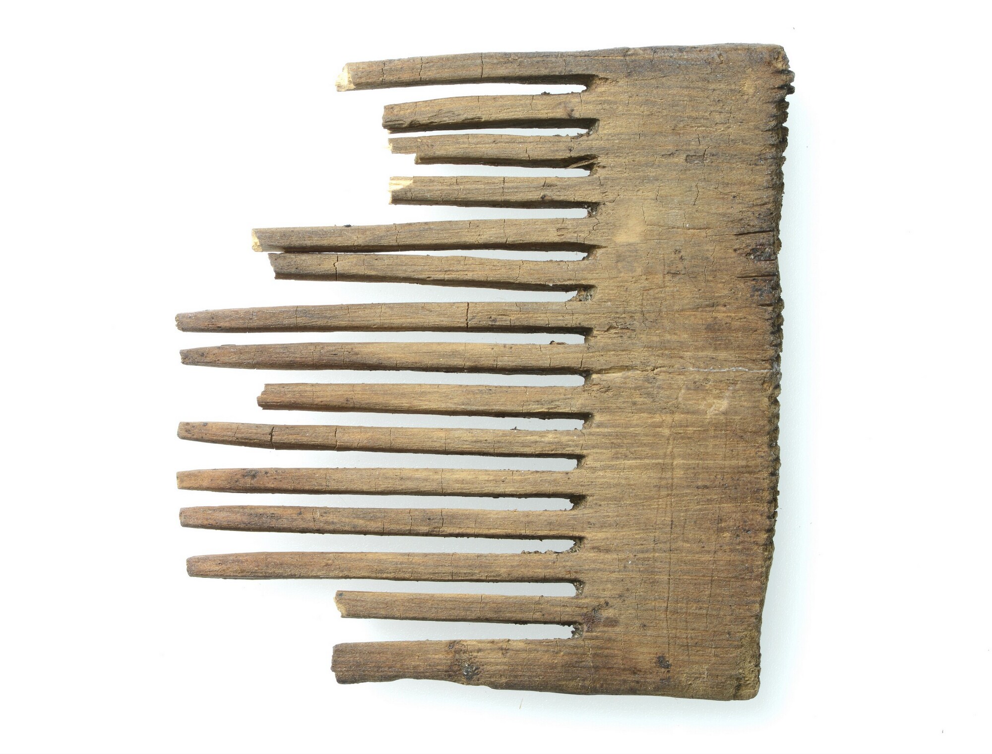 Kam, buxushout; enkelvoudig (oorspronkelijk ook tweezijdig, de aanzetten van de fijne tanden zijn nog te zien), grove tanden