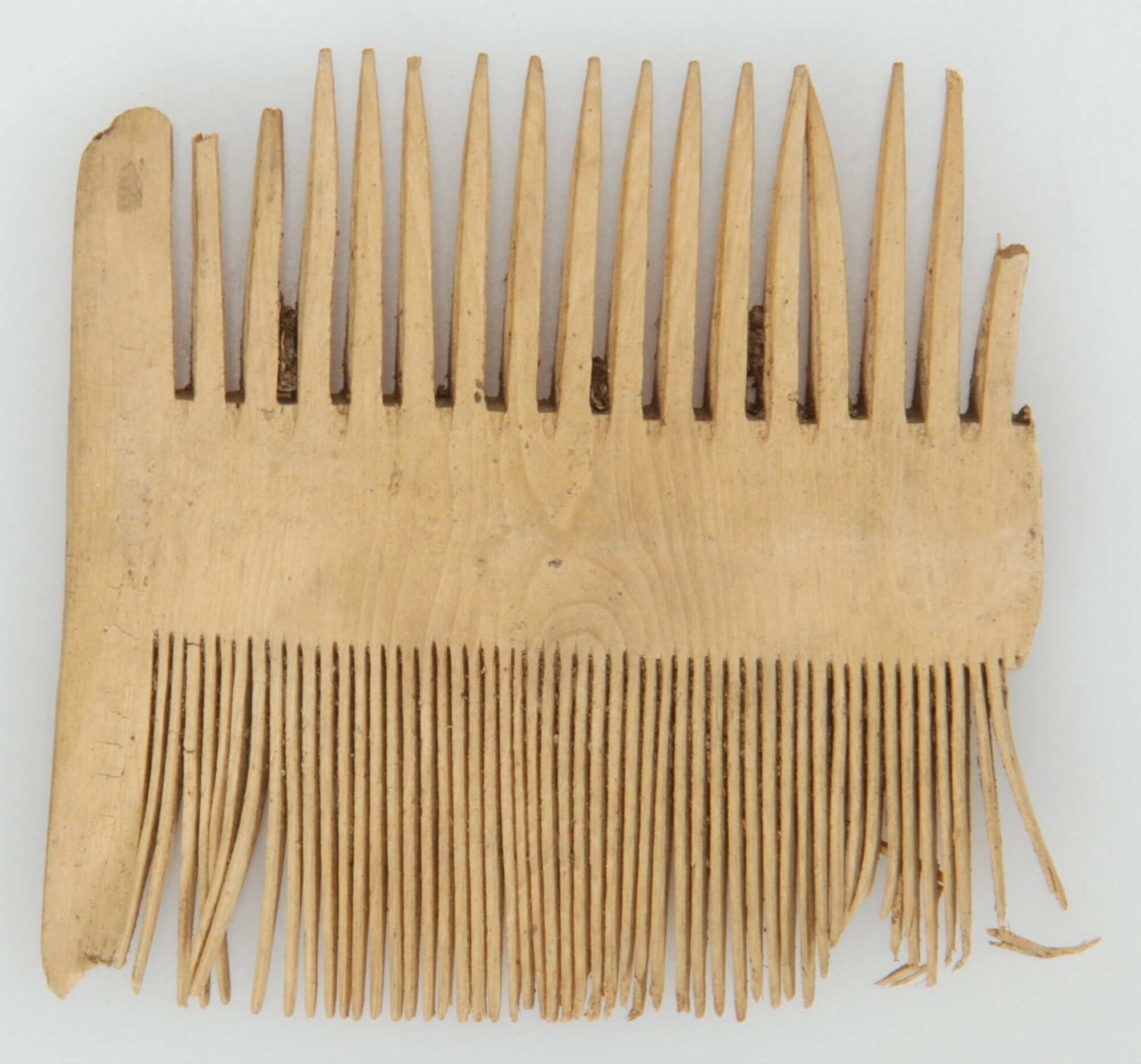 Kam; hout; houten kam met een dubbele rij tanden, aan de ene zijde grof en aan de andere zijde fijn