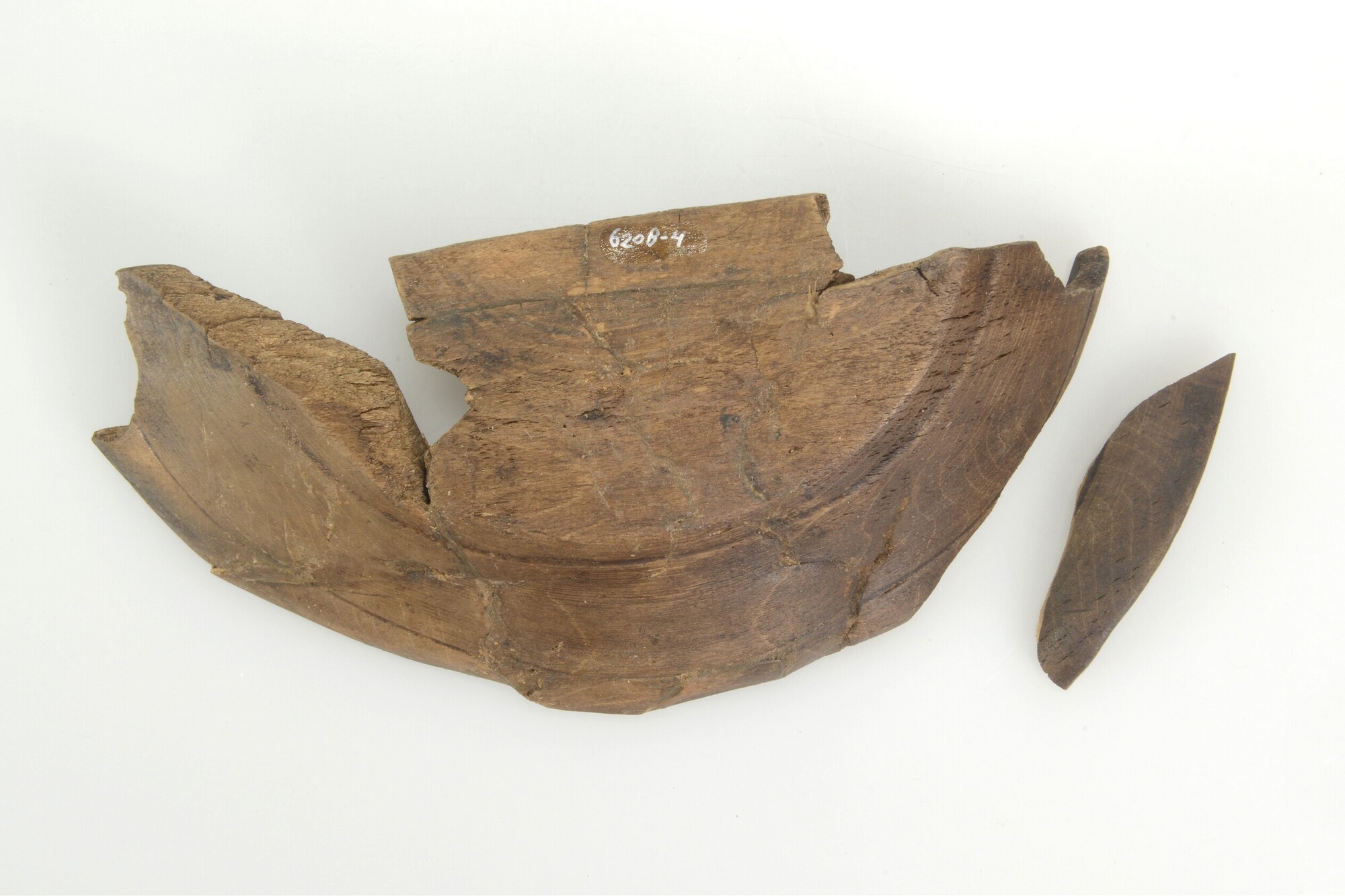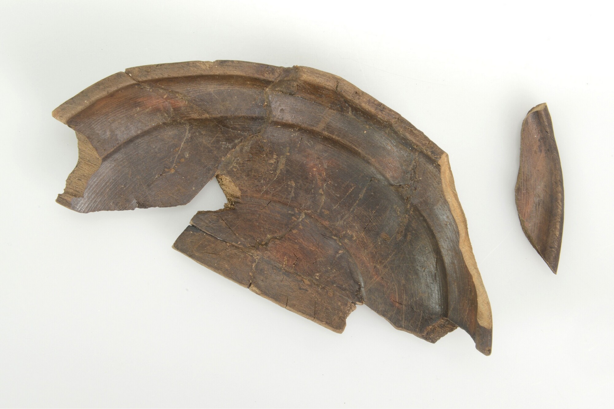 Bord; verdikte rib aan de binnenzijde en aan de buitenzijde zijn twee diepe draairillen aanwezig; inwendig snijsporen