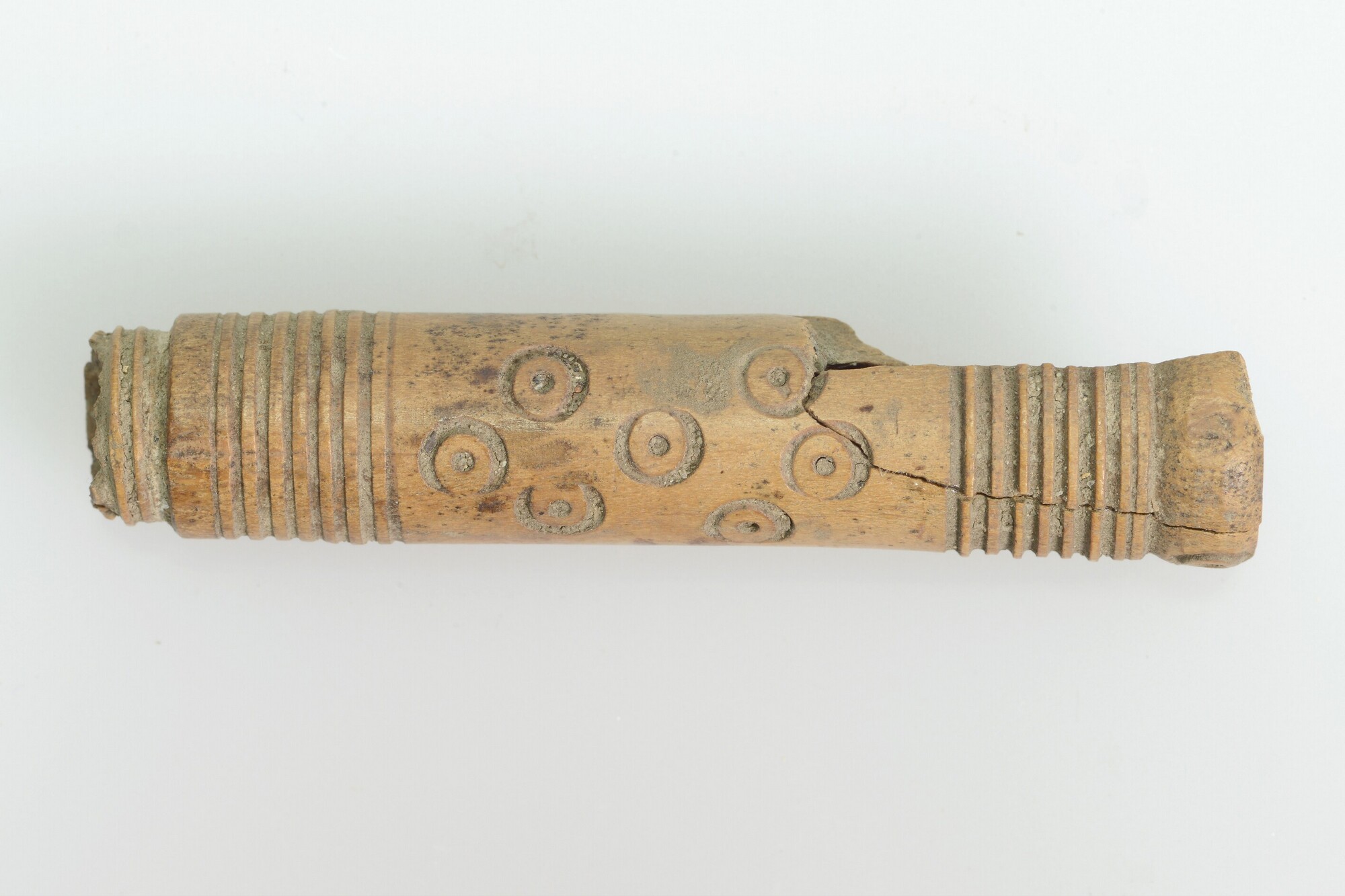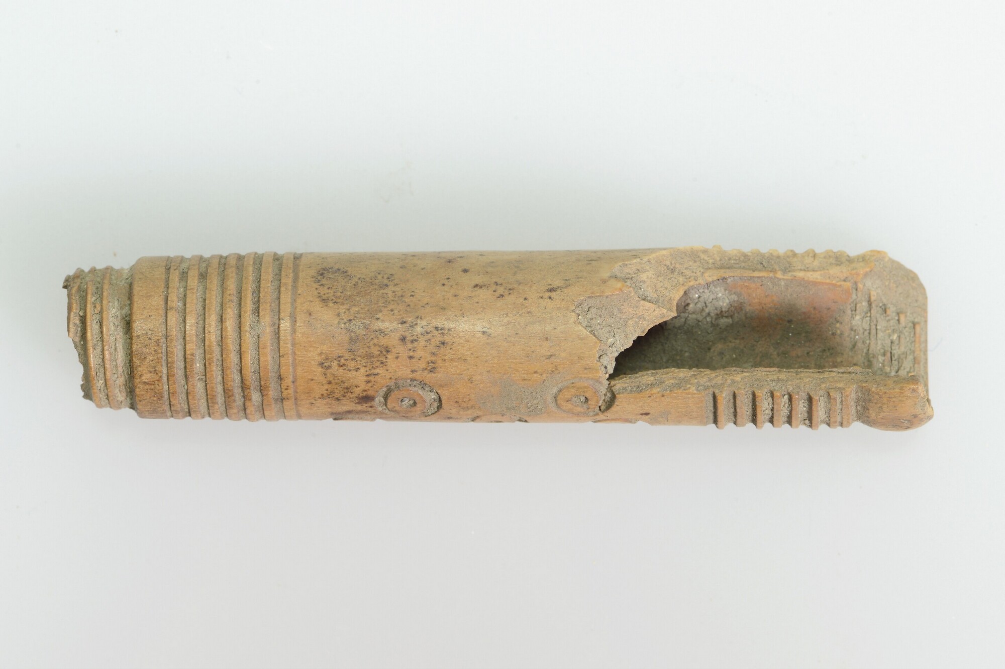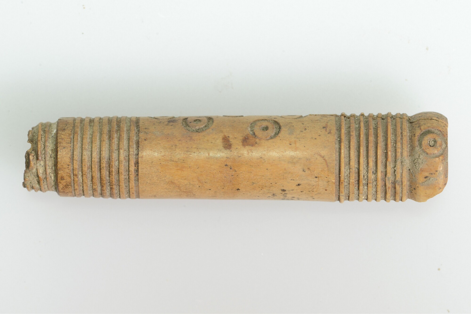 Naaldenkoker; beide uiteinden versierd met fijn uitgesneden parallelle lijnen, puntcirkelversiering aan het bredere uiteinde en aan een zijde in het midden; schroefdraad aan de buitenzijde van het smalle uiteinde en aan de binnenzijde van het brede uiteinde