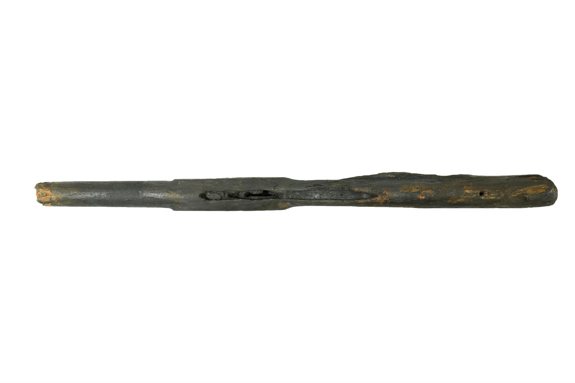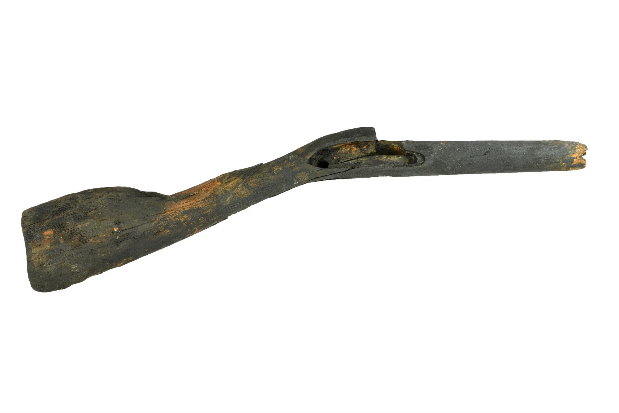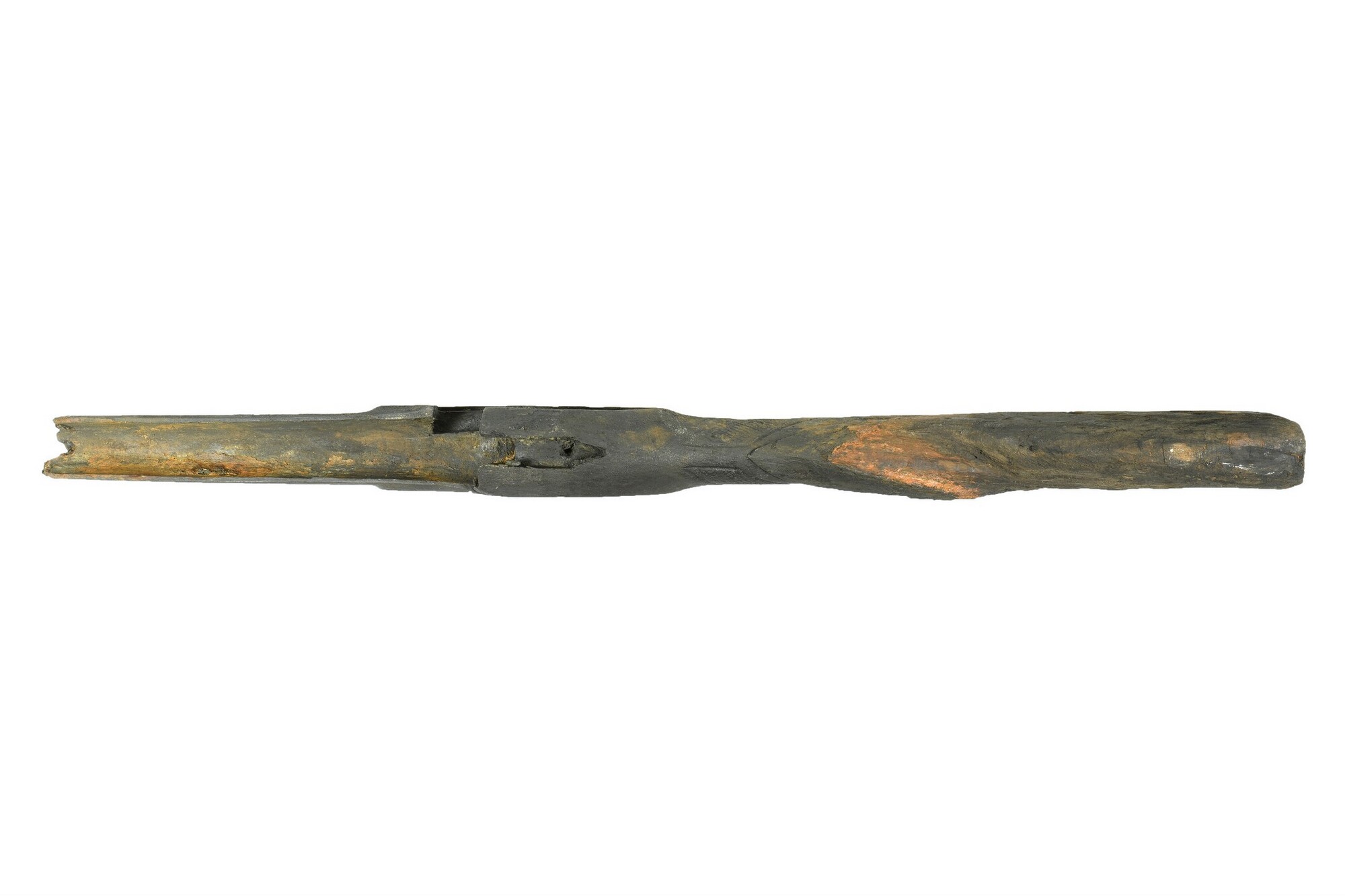 Musket; deels versierd met gegraveerd ruitjespatroon; behoort bij 6351-01 en 5479-01, de twee musketten zijn samen gevonden met de ijzerconcretie eraan vast