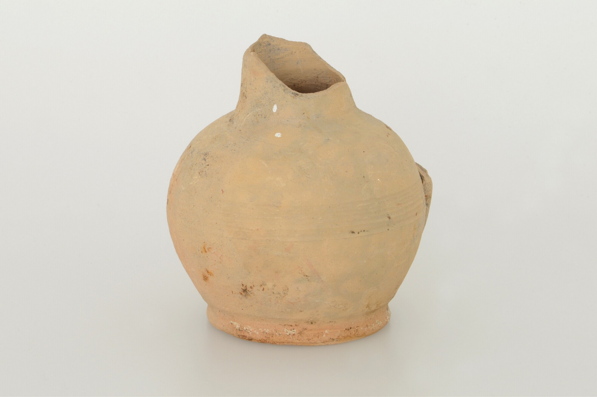 Kan; wa-kan-1; roodbakkend; halffabricaat, biscuit; concentrische cirkels op buik, standvlak, verticaal lintoor (ontbreekt); productieplaats: Enkhuizen