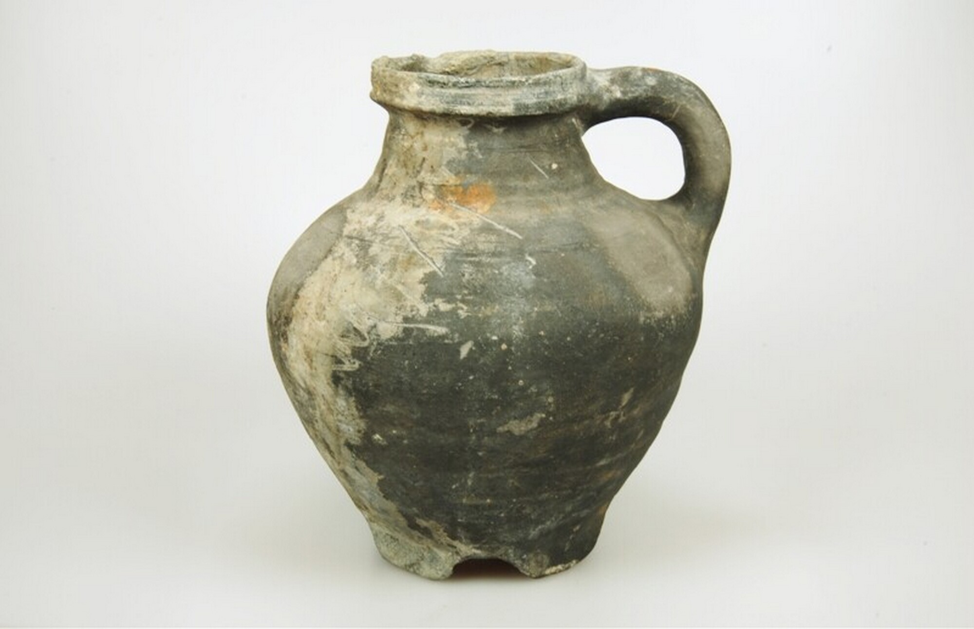 Kan, g-kan-9; bolle kan met hoge schouder, kraagrand met dekselgeul, vier lobvoeten, verticaal worstoor; grijsbakkend aardewerk; herkomst: Nederland