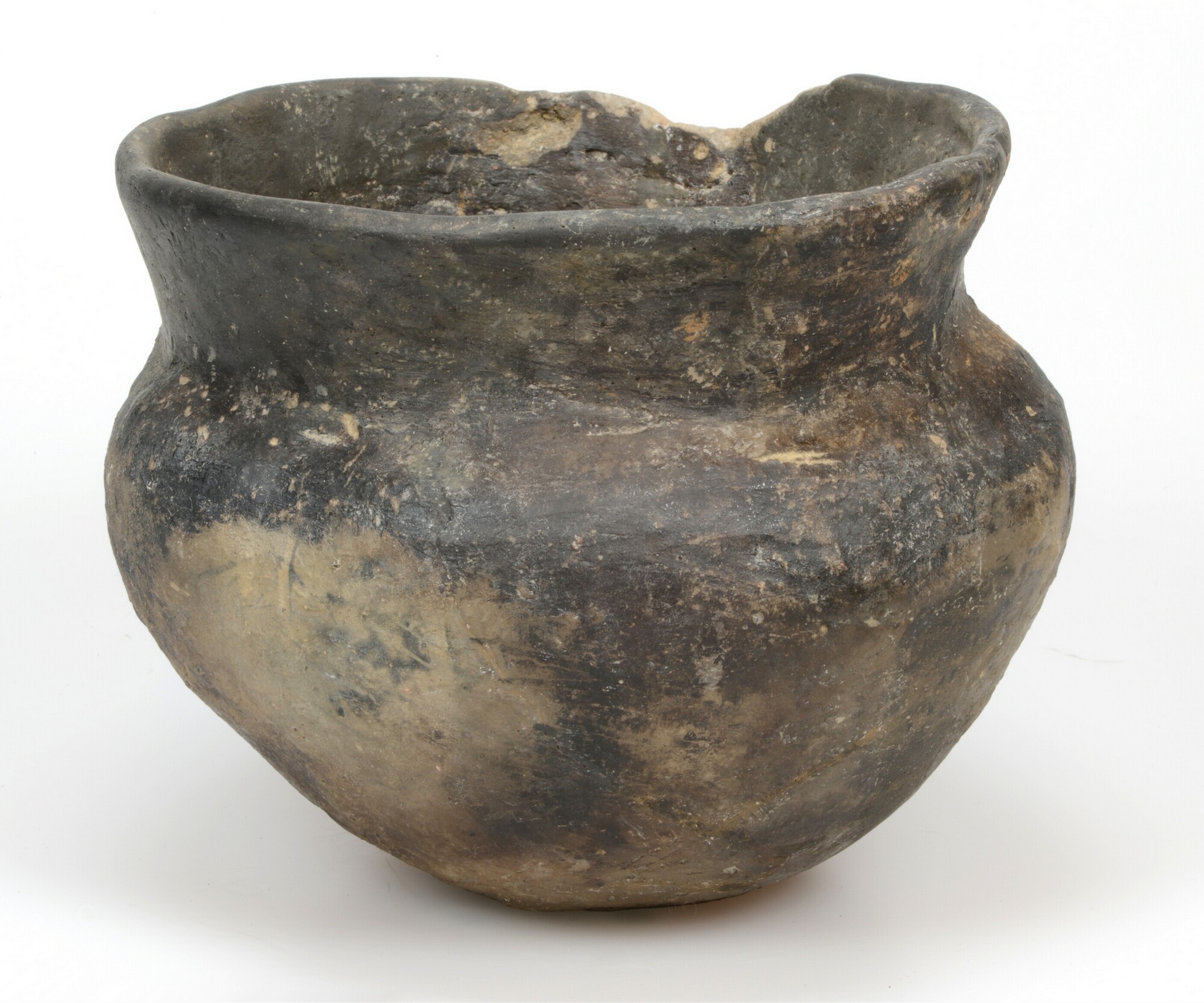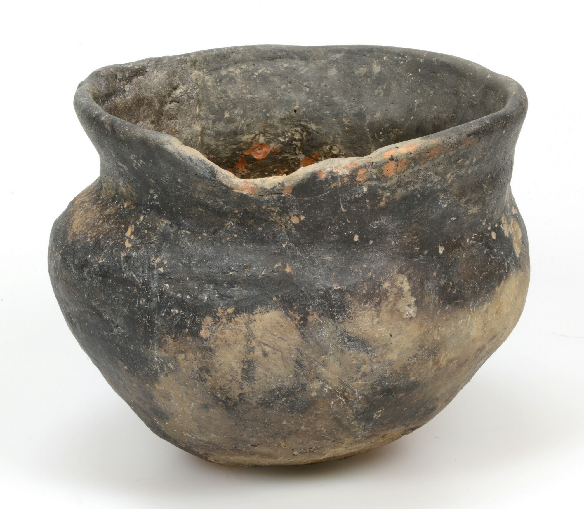 Pot; Ruinen-Wommels; karakteristieke knik onder de hals en een uitgebogen rand, waardoor de pot een s-vormig profiel heeft met een hoge ronde buik; donkergrijze kleur met een zwarte gepolijste zone op de buik; bruinkleurig aankoeksel binnenzijde; standvlak