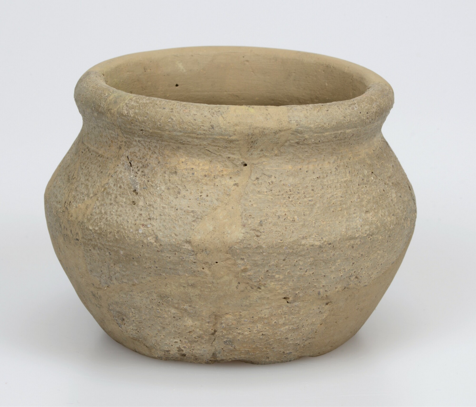 Beker / knikwandpot; tweeledig model met opstaande rand, standvlak; Merovingisch ruwwandig draaischijfaardewerk; reducerend baksel met grove magering; herkomst: Rijnland
