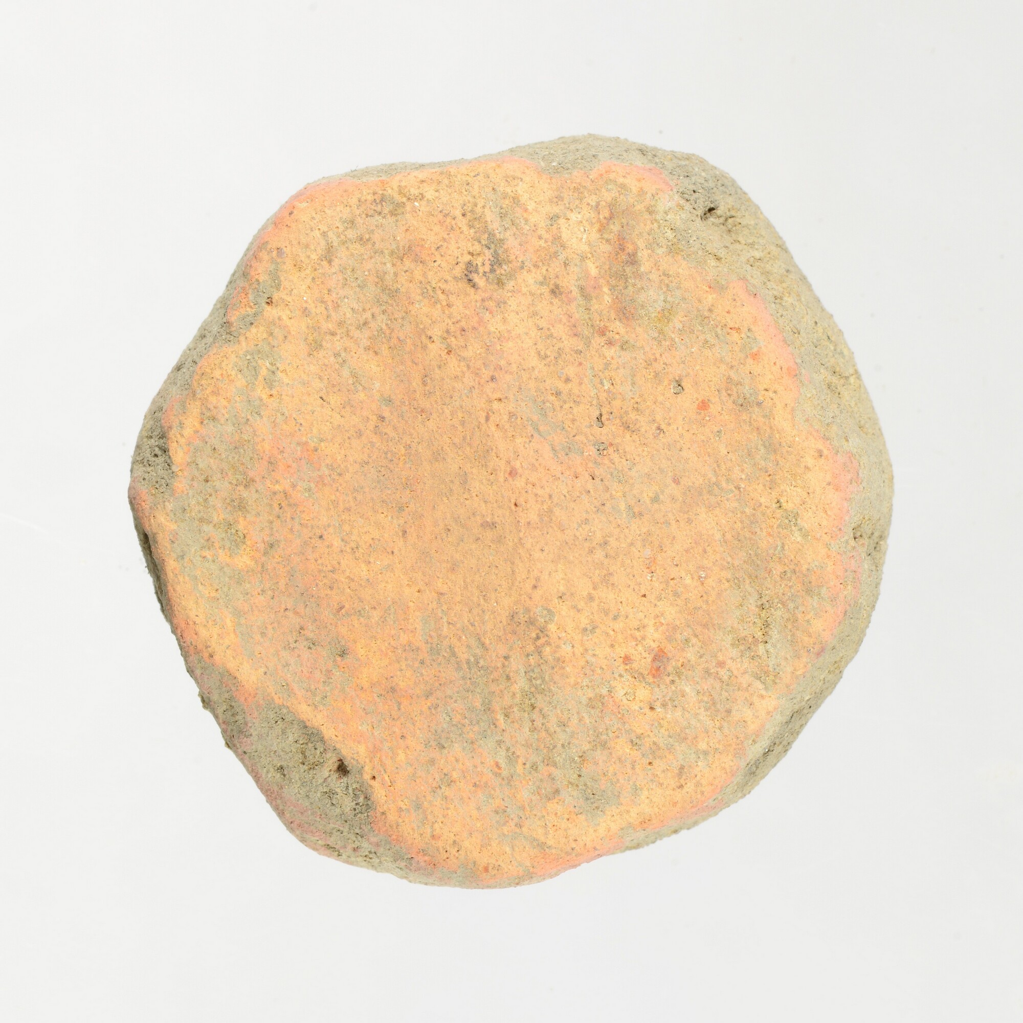 Speelschijf; gemaakt van scherf van inheems-Romeins aardewerk; oranje/grijs; vondstomstandigheden: gevonden over het vlak bij het verdiepen van vlak 2-3, Z7
