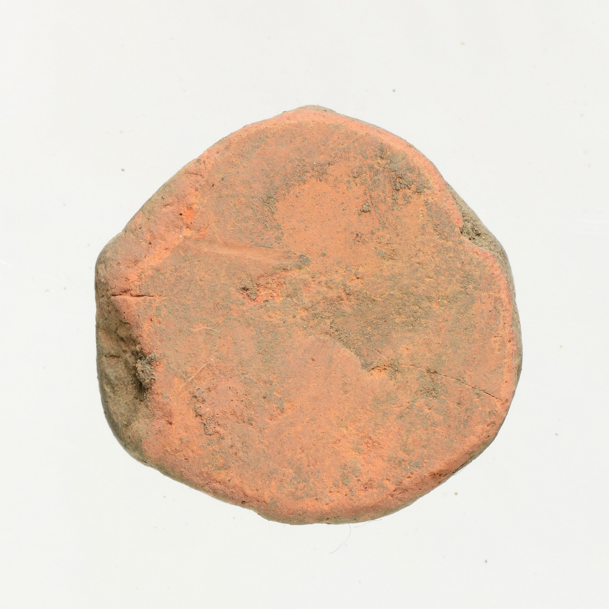 Speelschijf; gemaakt van scherf van inheems-Romeins aardewerk; oranje/grijs; vondstomstandigheden: gevonden over het vlak bij het verdiepen van vlak 2-3, Z7