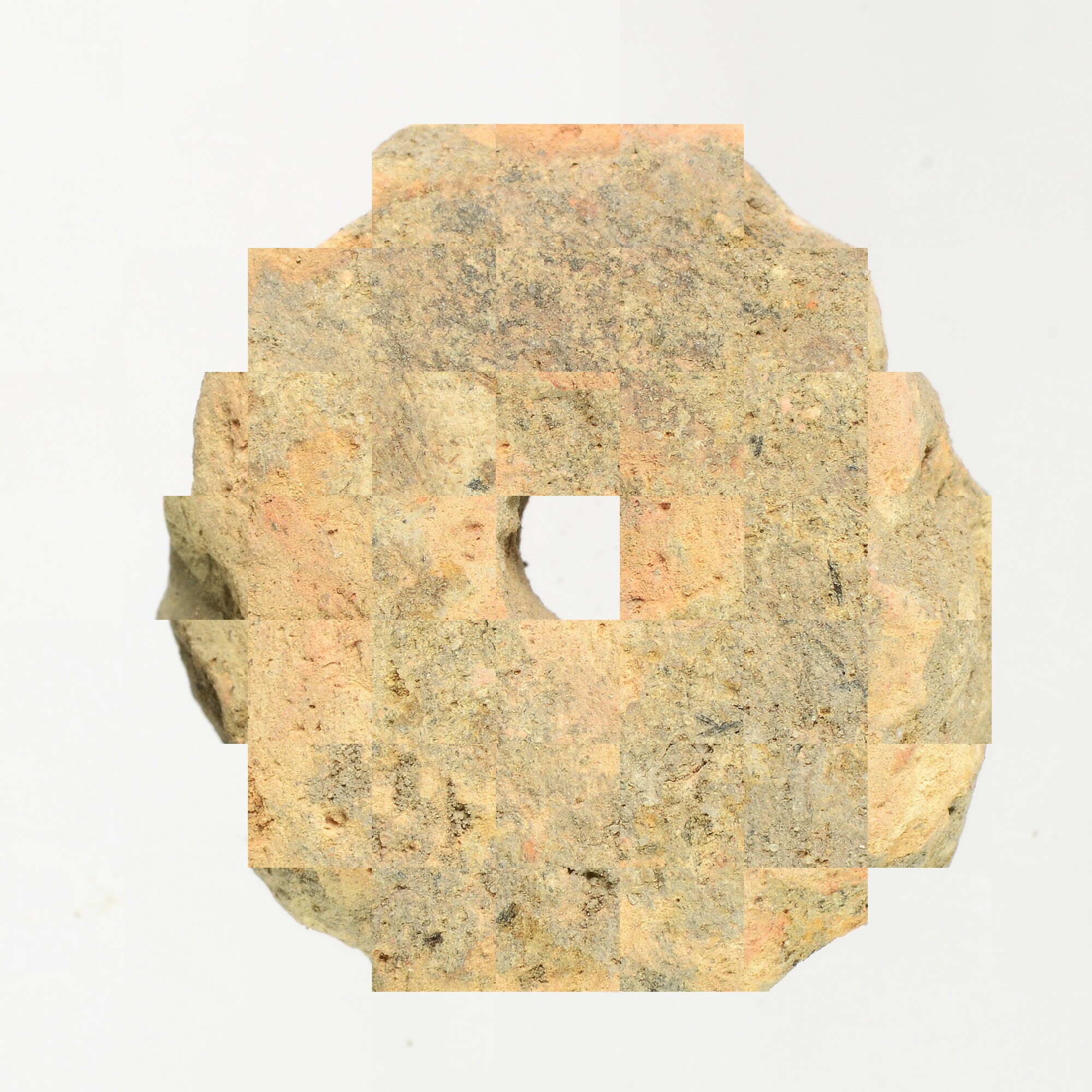 Spinsteen; gemaakt van scherf van inheems-Romeins aardewerk; oranje/grijs; vondstomstandigheden: Z35, uit TM