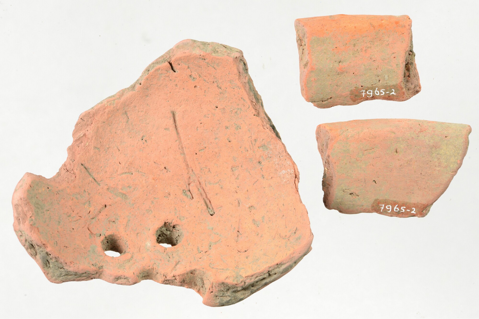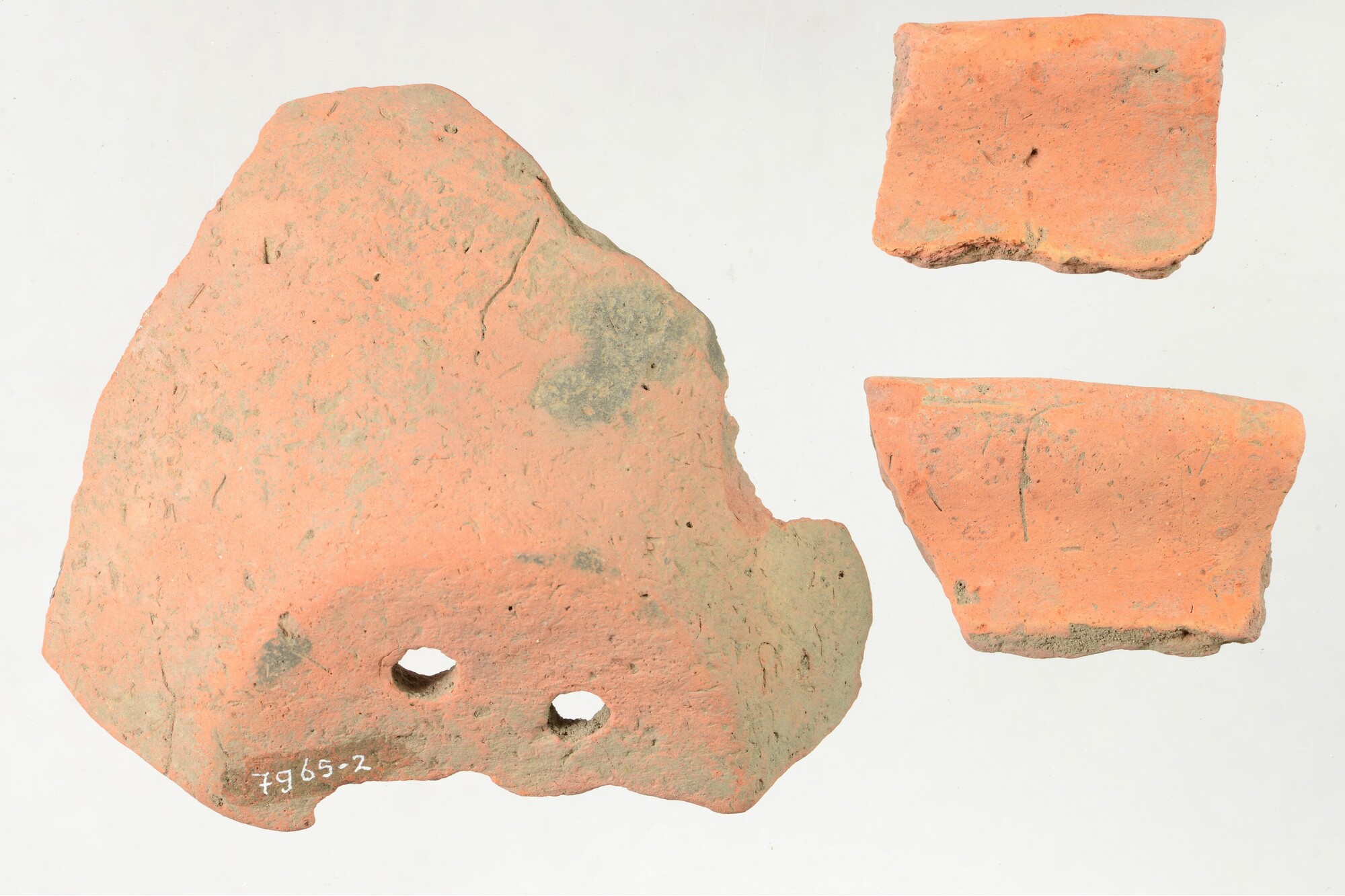 Kaasvorm/zeef; fragment bodem/wand en twee aan elkaar passende randfragmenten; inheems-Romeins aardewerk; oranje met grijze kern; gaten onderin de bodem, voor het bakken aangebracht (dia 0.7 cm); vondstomstandigheden: Z8, gevonden in ZW hoek tijdens verdiepen van II naar III