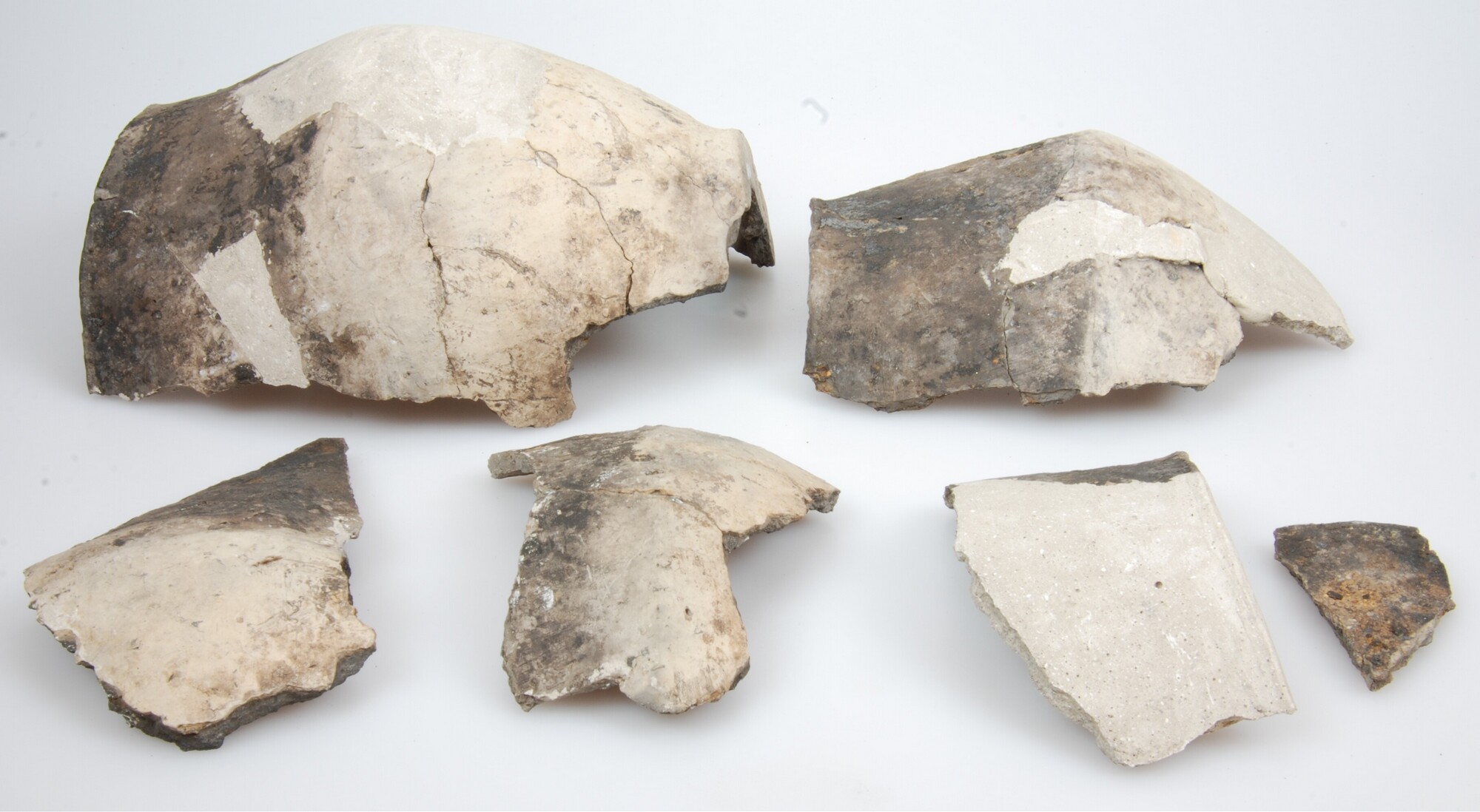 Pot; Hoogkarspel aardewerk; 6 fragmenten pot ; verschraald met stukjes kwarts; aan de binnenzijde bevinden zich verkoolde resten