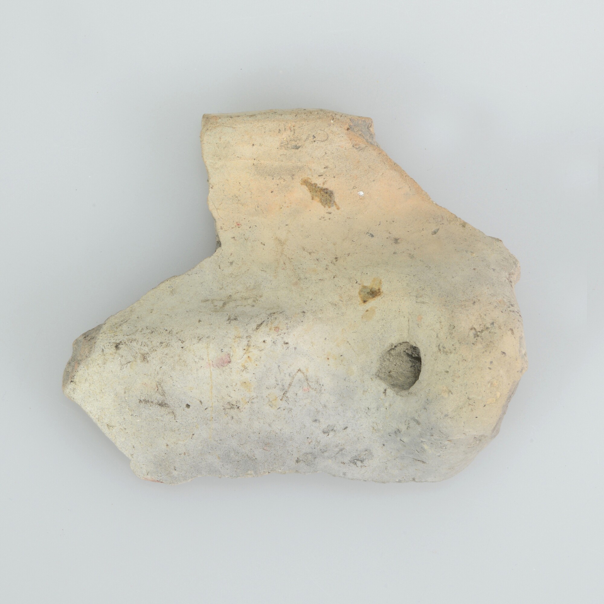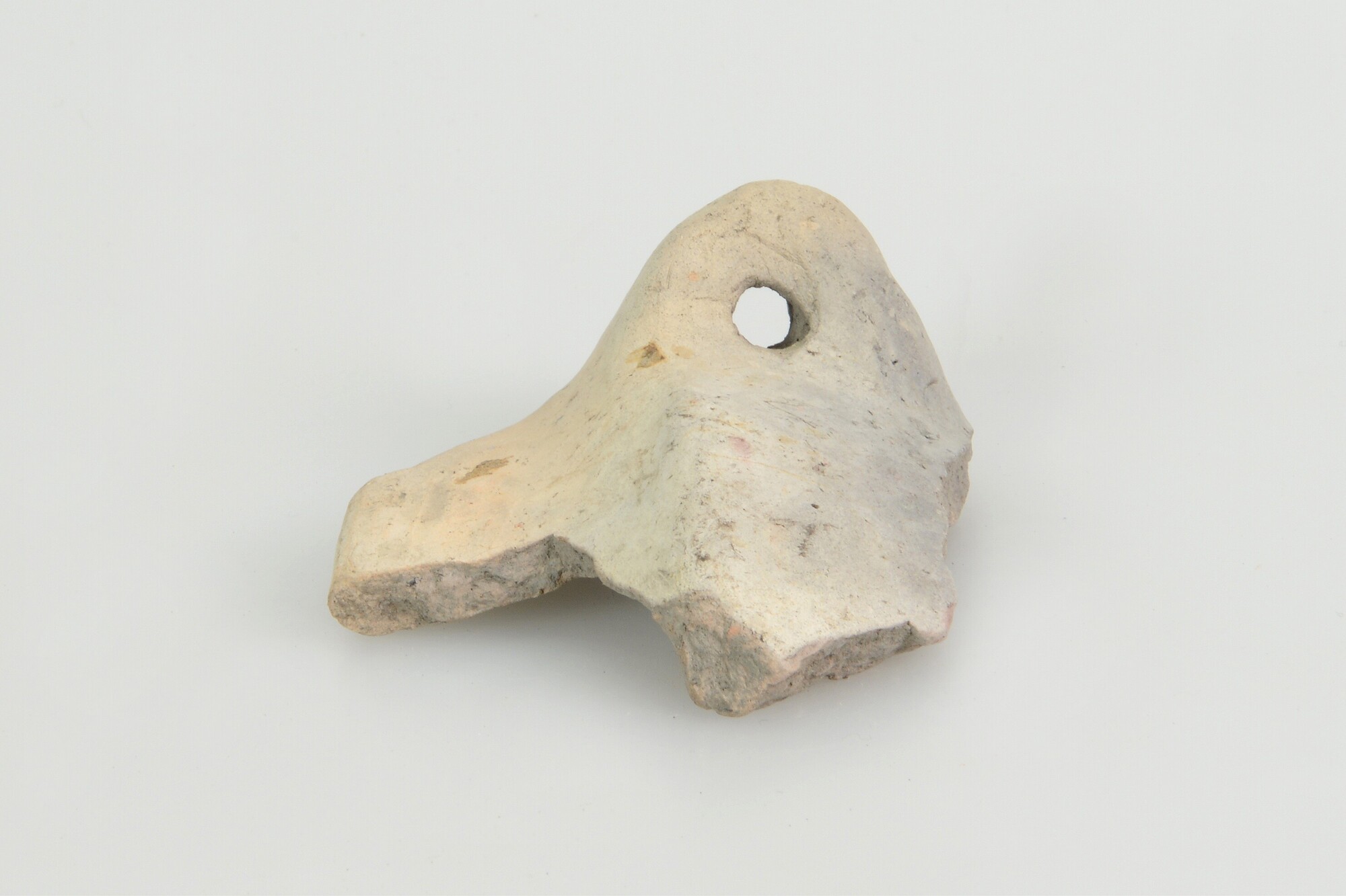Pot; Hoogkarspel-Jong aardewerk; randfragment tweedelige pot met verticaal knobbeloor; uitwendig oppervlakte geglad; fijne zandmagering