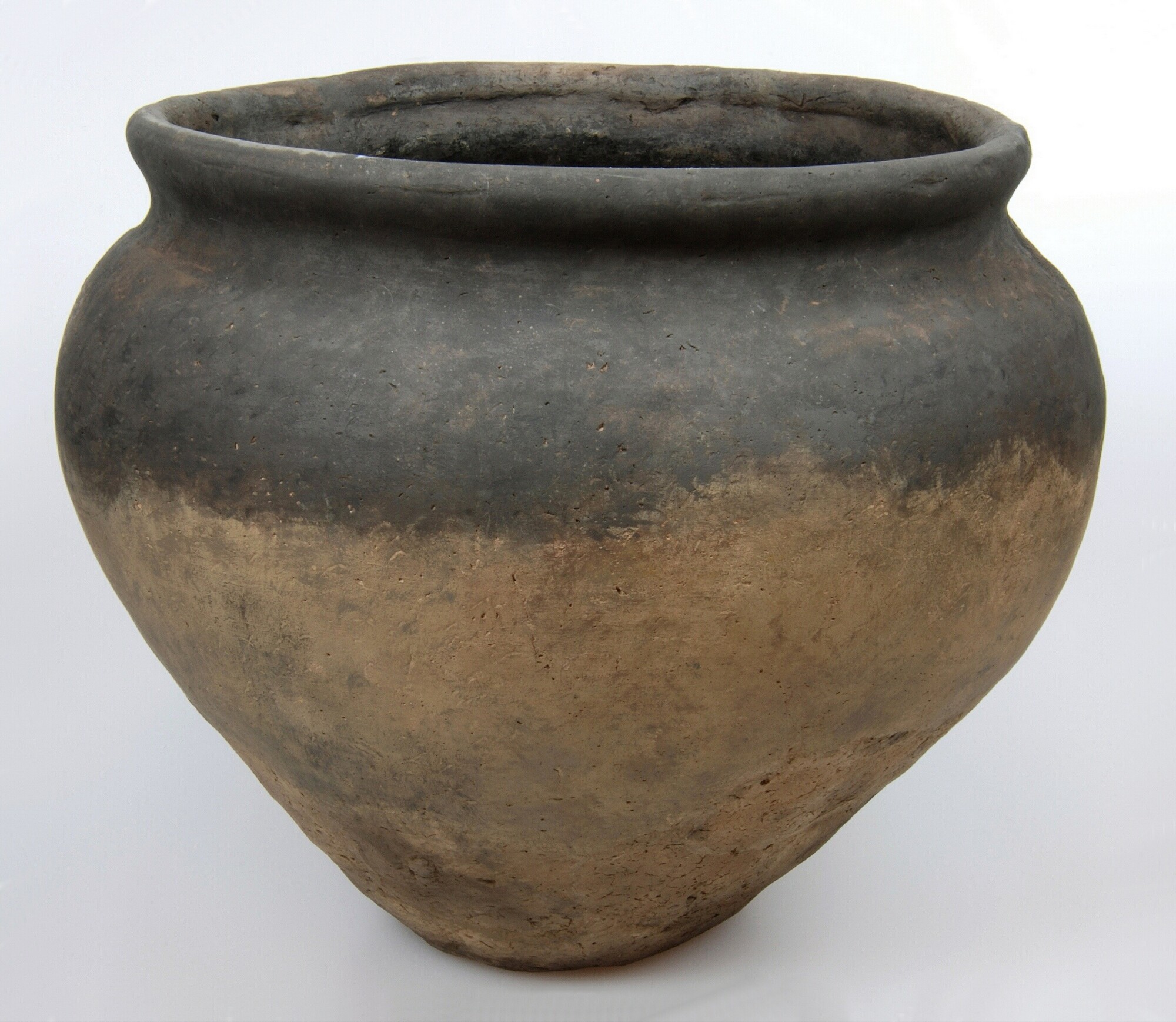Kookpot; inheems-romeins aardewerk; wijdmondige pot met korte schouder en c-rand; standvlak; beroet vanaf net boven de grootste buikomvang tot aan de rand; binnenzijde aangekoekte kookresten