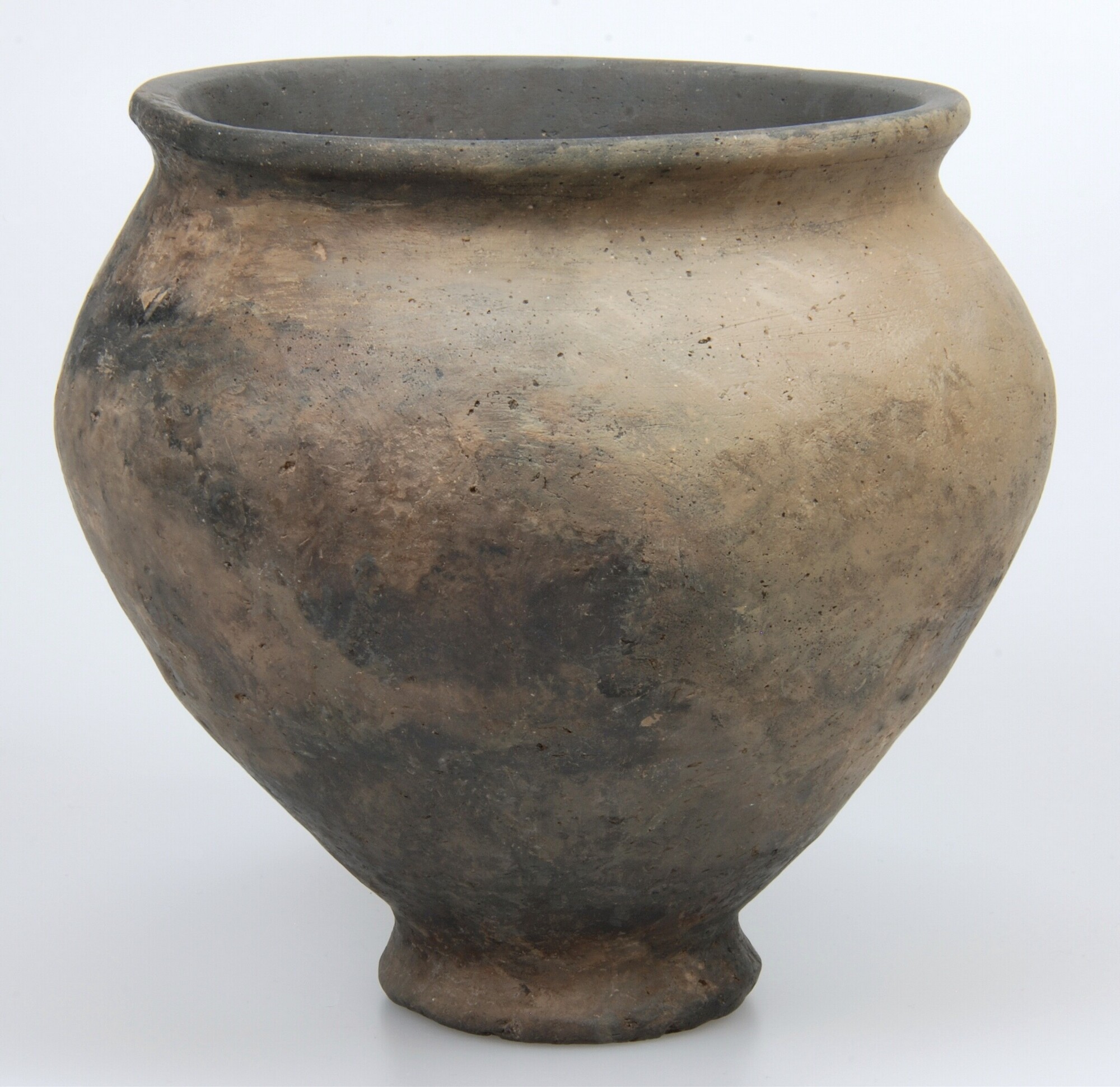Kelkpot/situla; type Diederik F-IVa; inheems-Romeins aardewerk; handgevormd; wijdmondige bolle pot op een hoge, platte standvoet; vrijwel even hoog als breed en de A-rand is meervoudig gefacetteerd; deels geglad oppervlak; roetsporen binnenzijde