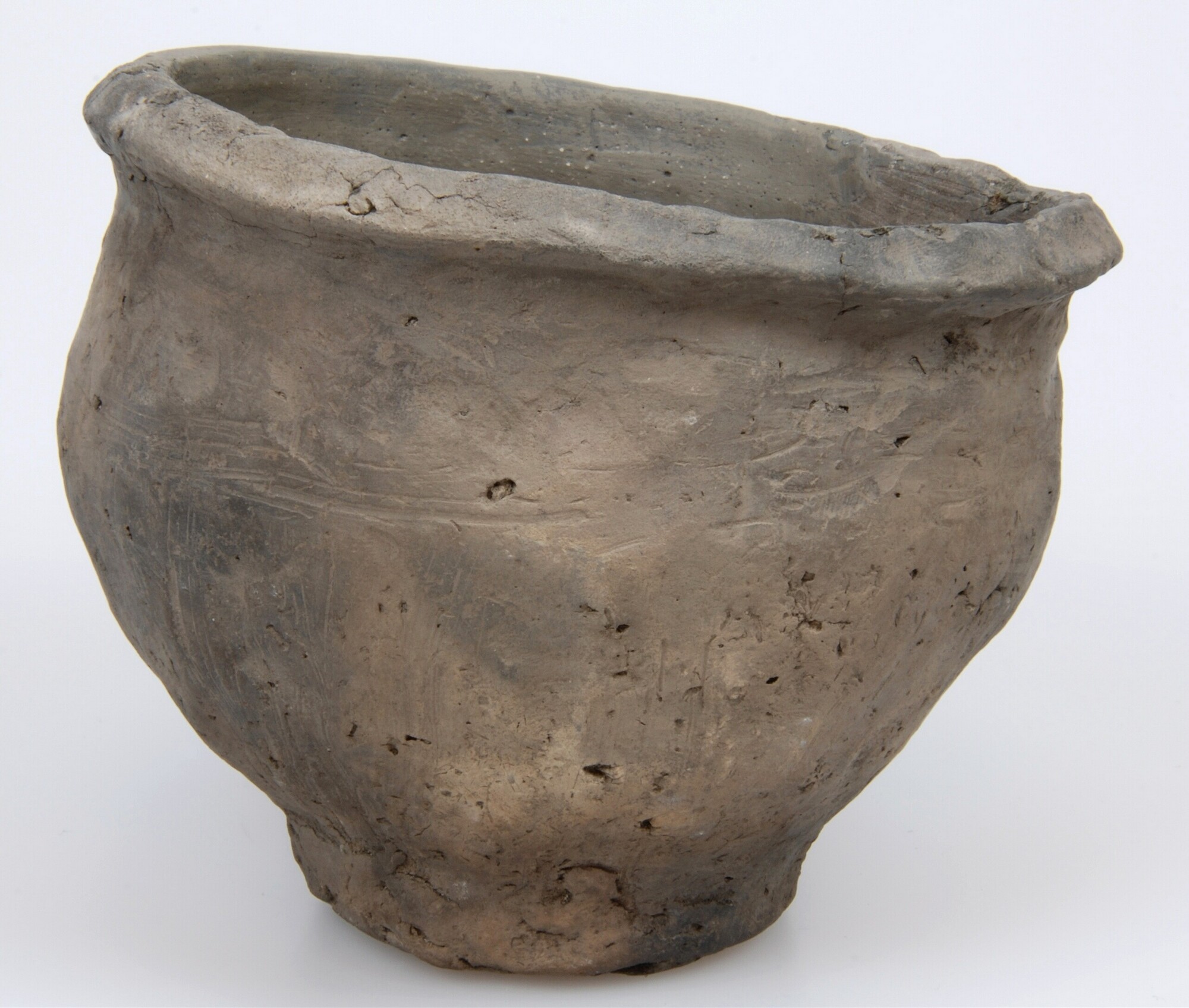 Pot; Diederik type F-VI; inheems-Romeins aardewerk; handgevormd; kleine bolle pot met brede rand en standvlak; de pot is ongelijk in hoogte; organische magering