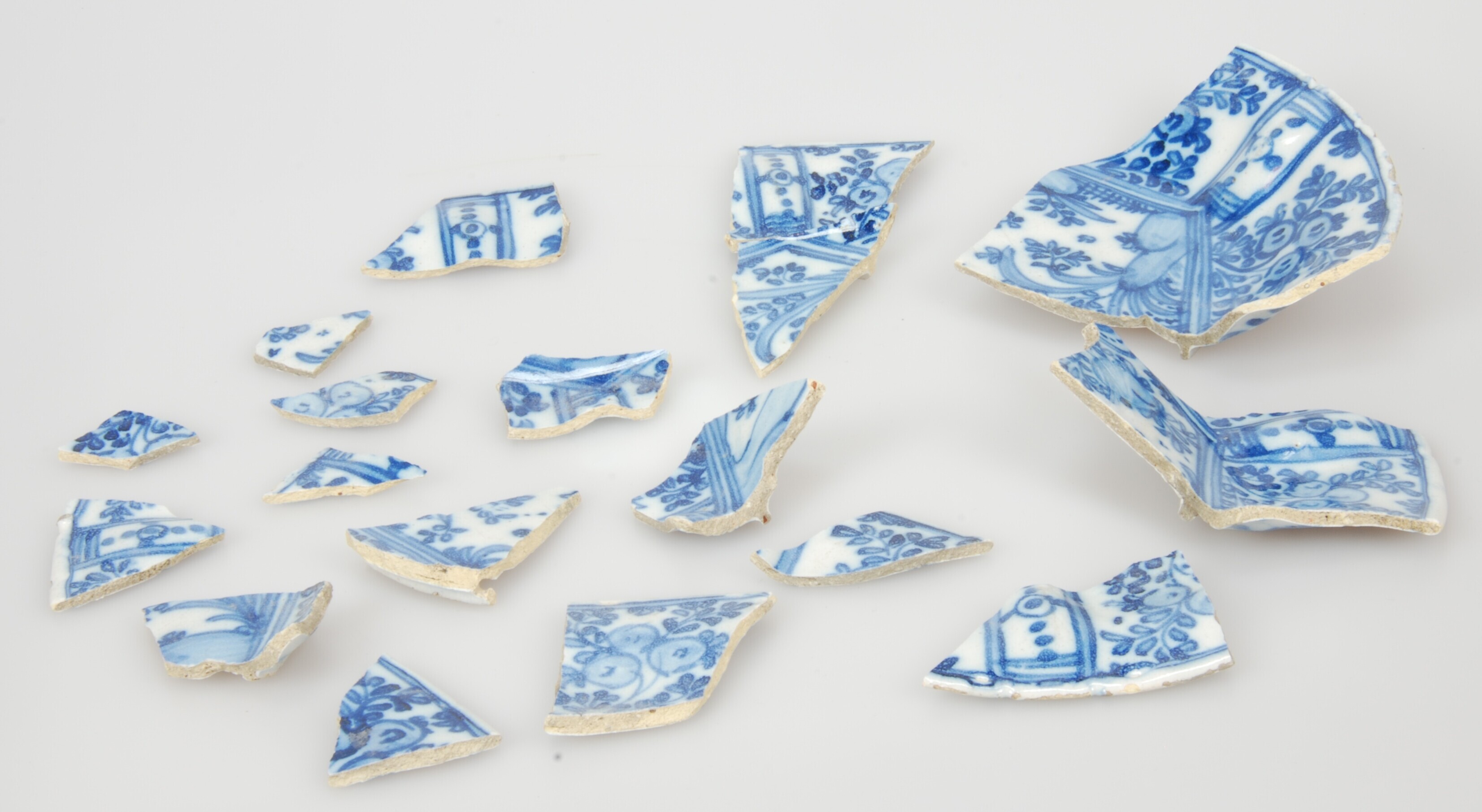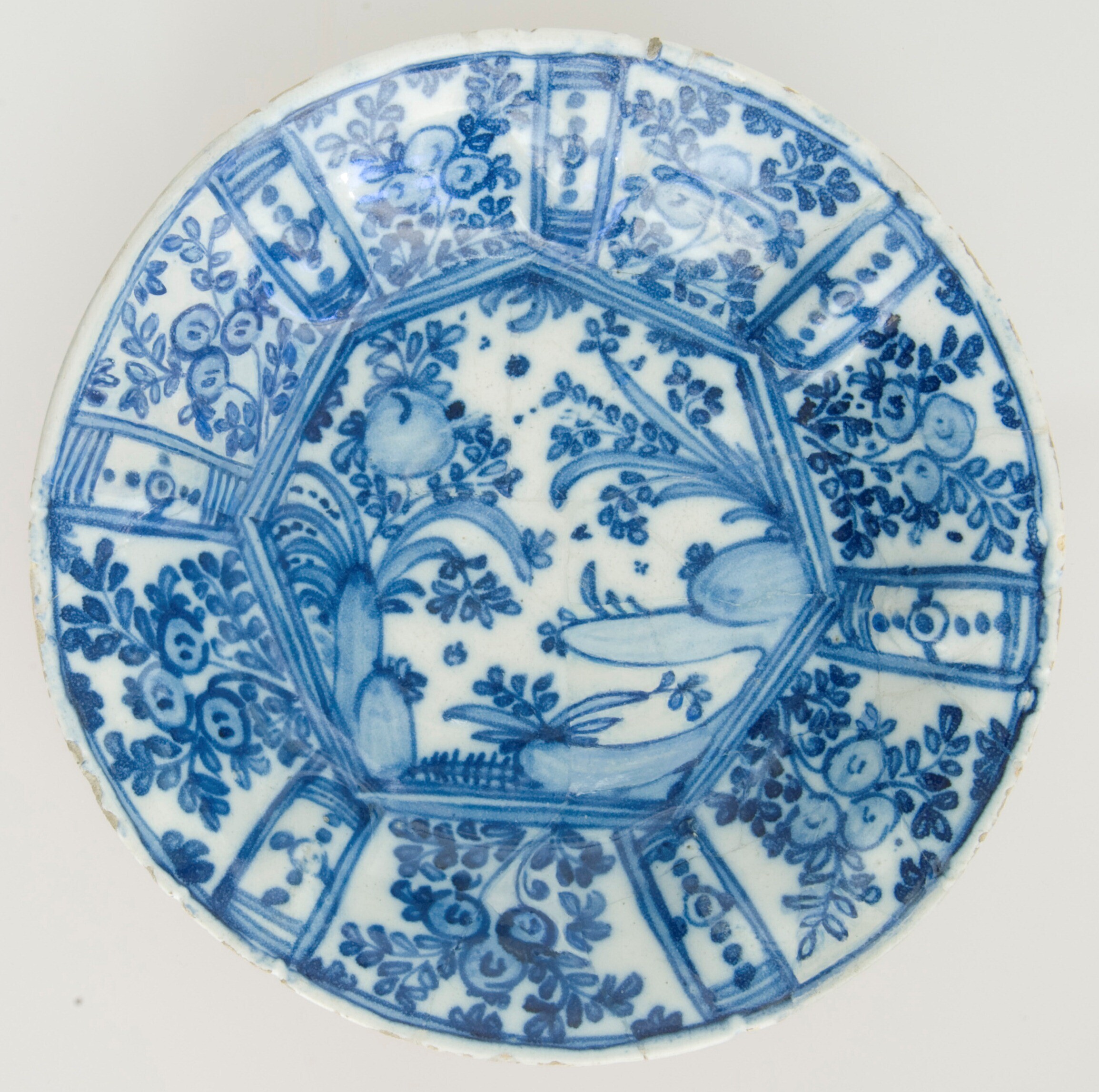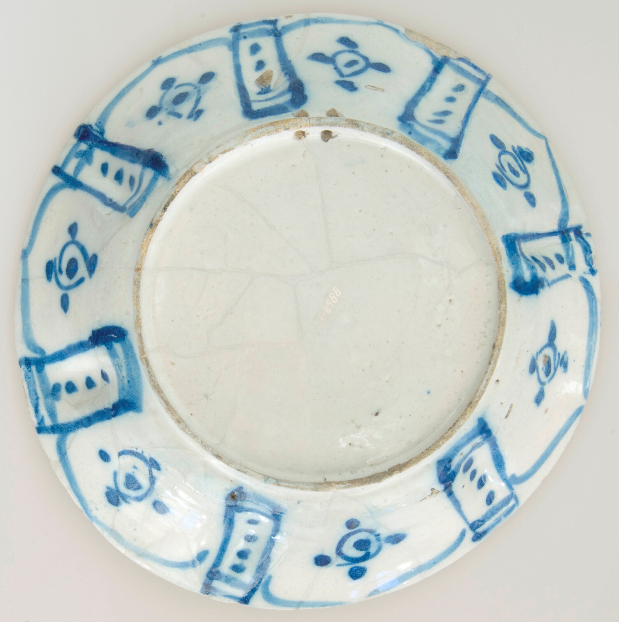 Plooischotel; po-bor-3; bord met vlakke spiegel en naar buiten geknikte platte vlag, standring; Portugese faience (imitatie kraakporselein); tinglazuur; blauwe beschildering, spiegel: landschap met struiken en rotsen, vlag: panelen met florale motieven; uitwendig: simpele panelen en florale motieven; doorboorde standring; herkomst: Lissabon, Portugal