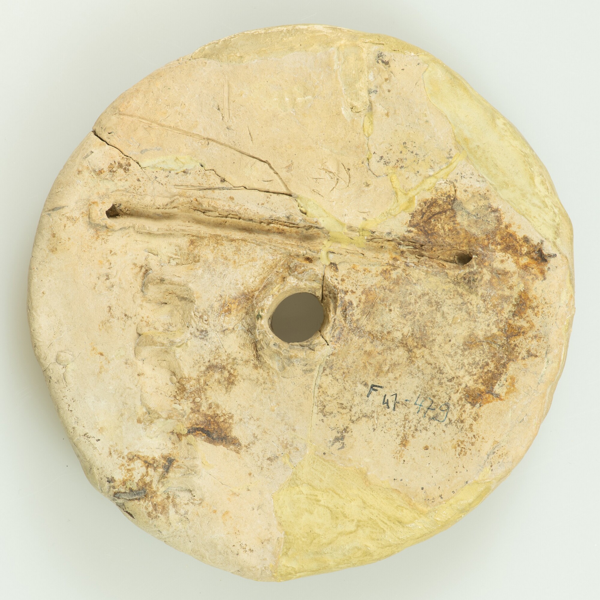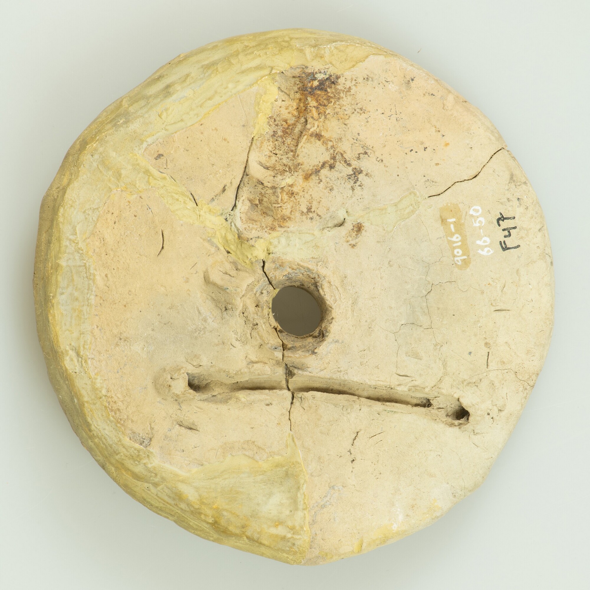 Schijf; bakplaat/vliegwiel; Hoogkarspel-jong aardewerk; centrale doorboring met aan beide kanten een lijn- en vingertopversiering; vondstdatum: 2-9-1966