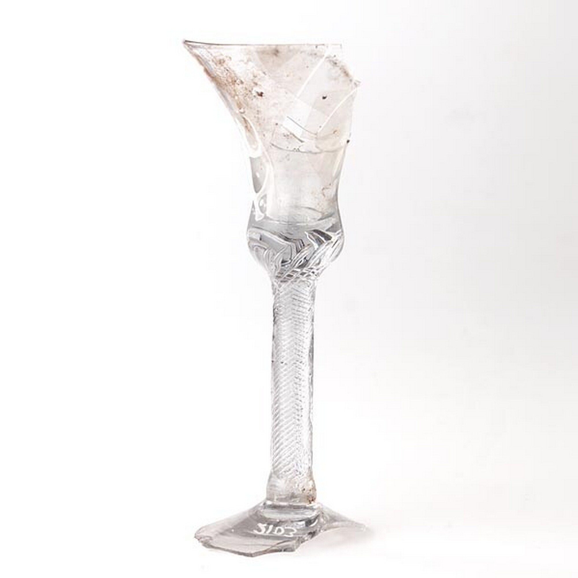 Kelkglas; gl-kel-; kleurloos; luchtslingerglas, de slinger loopt uit in de onderzijde van de cuppa; oudnr. 2103; datum: 8-5-1996, herkomst: Nederland of Engeland