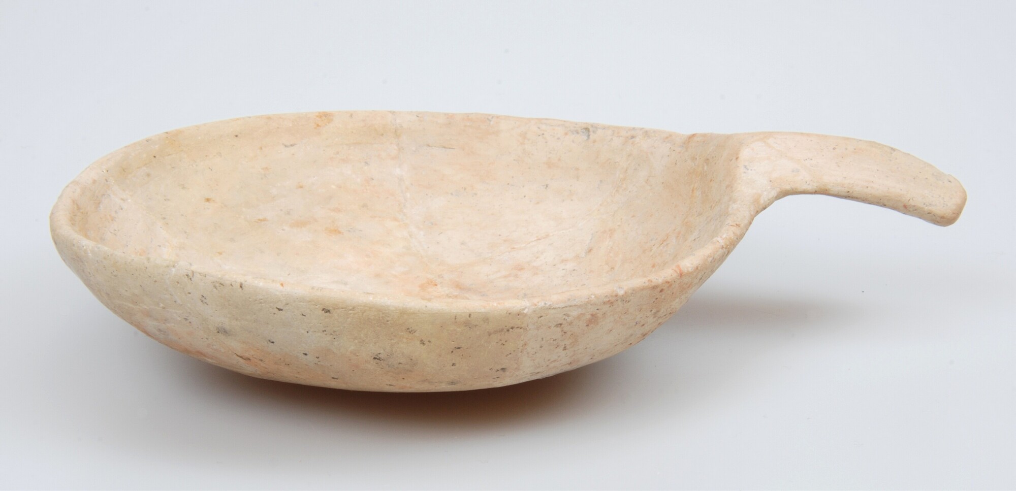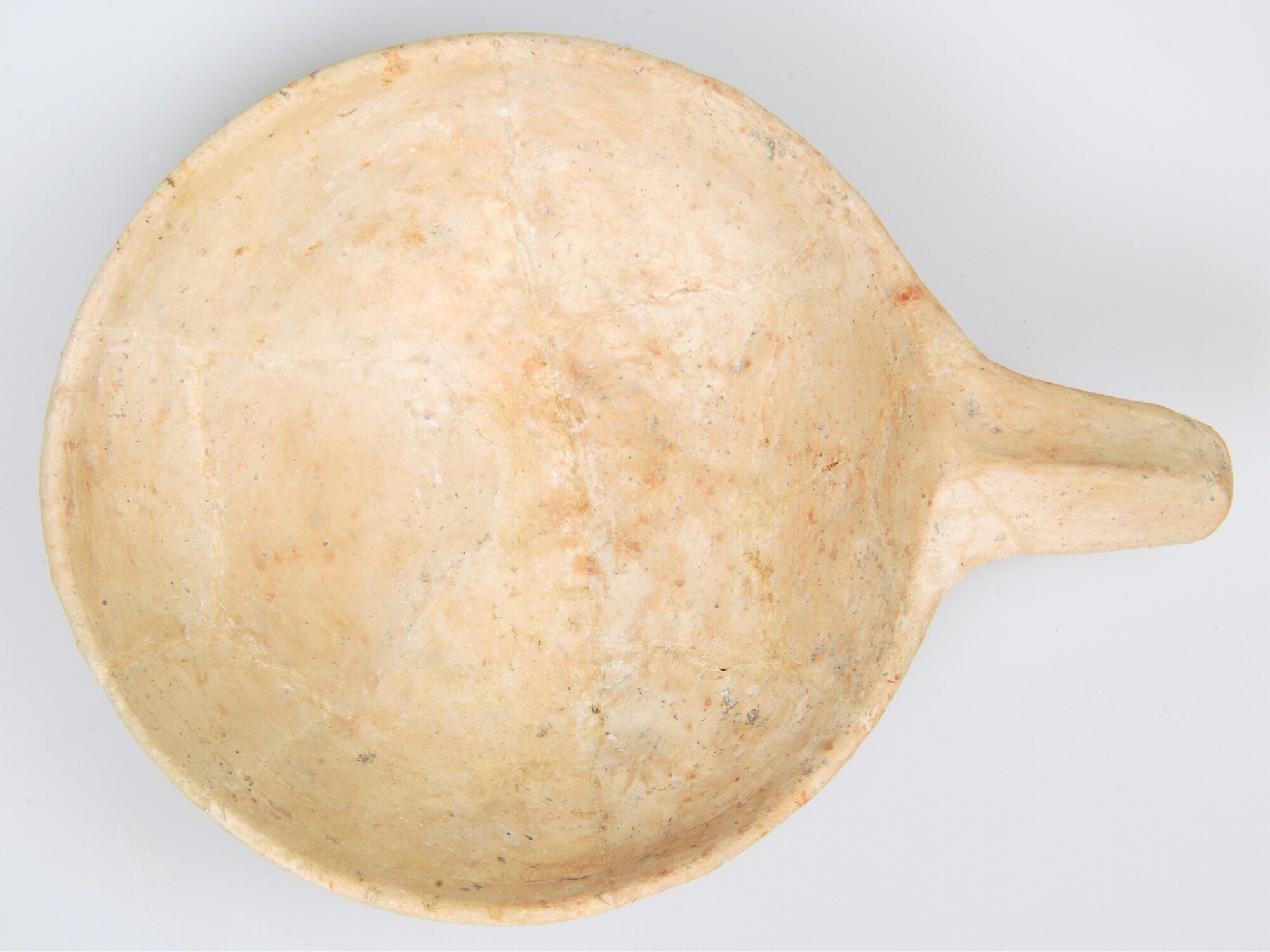 Bak; Hoogkarspel-Jong aardewerk (late-fase); de binnen- en buitenzijde van de ronde nap zijn gepolijst en voorzien van een aangeknede greep met opgeknepen ribbel; bolle bodem