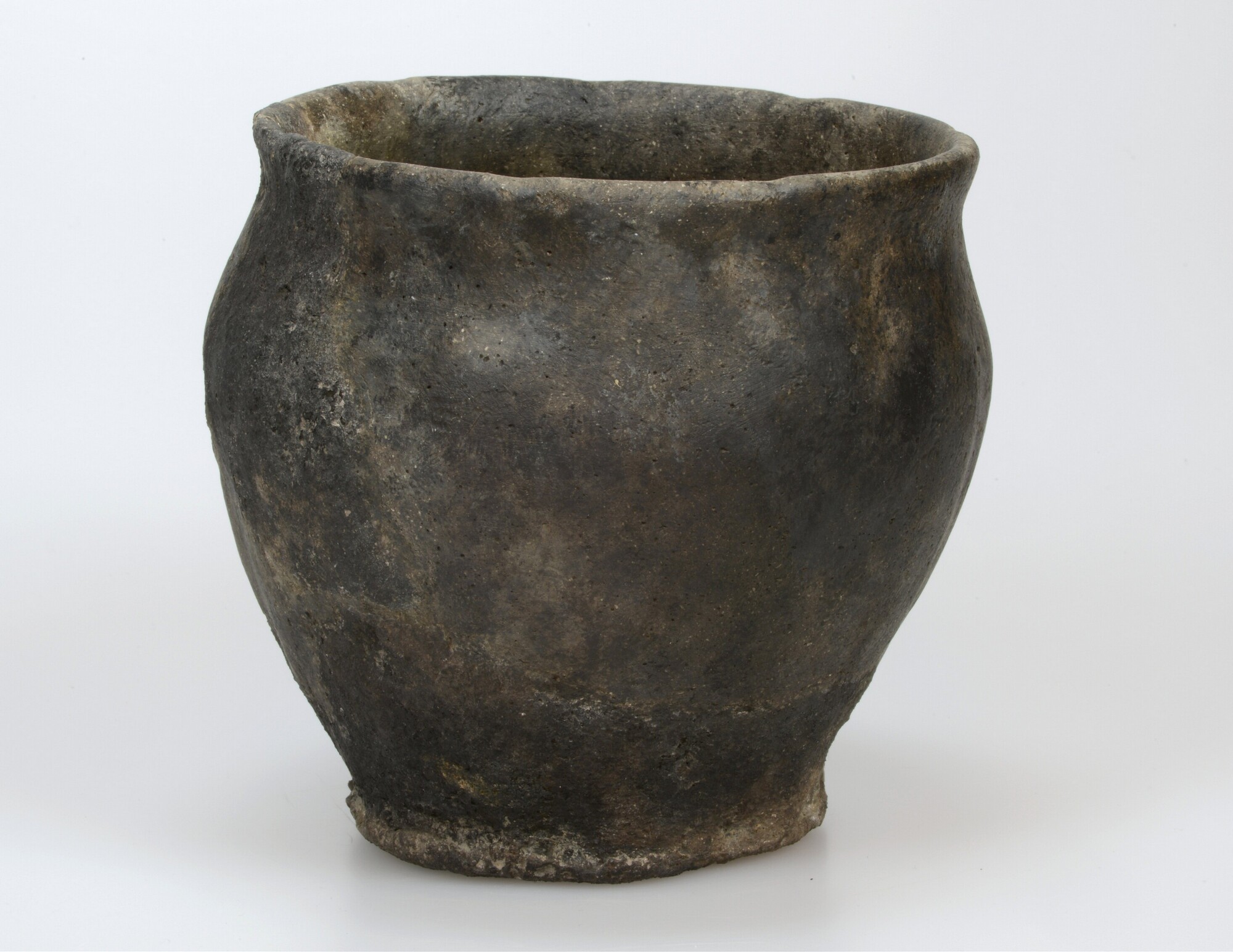 Kookpot; Hoogkarspel-Oud aardewerk; tonvormige pot met naar buitenstaande, afgeplatte rand op standvoet; relatief hard, reducerend gebakken en gemagerd met granietgruis; aankoeksel buitenzijde