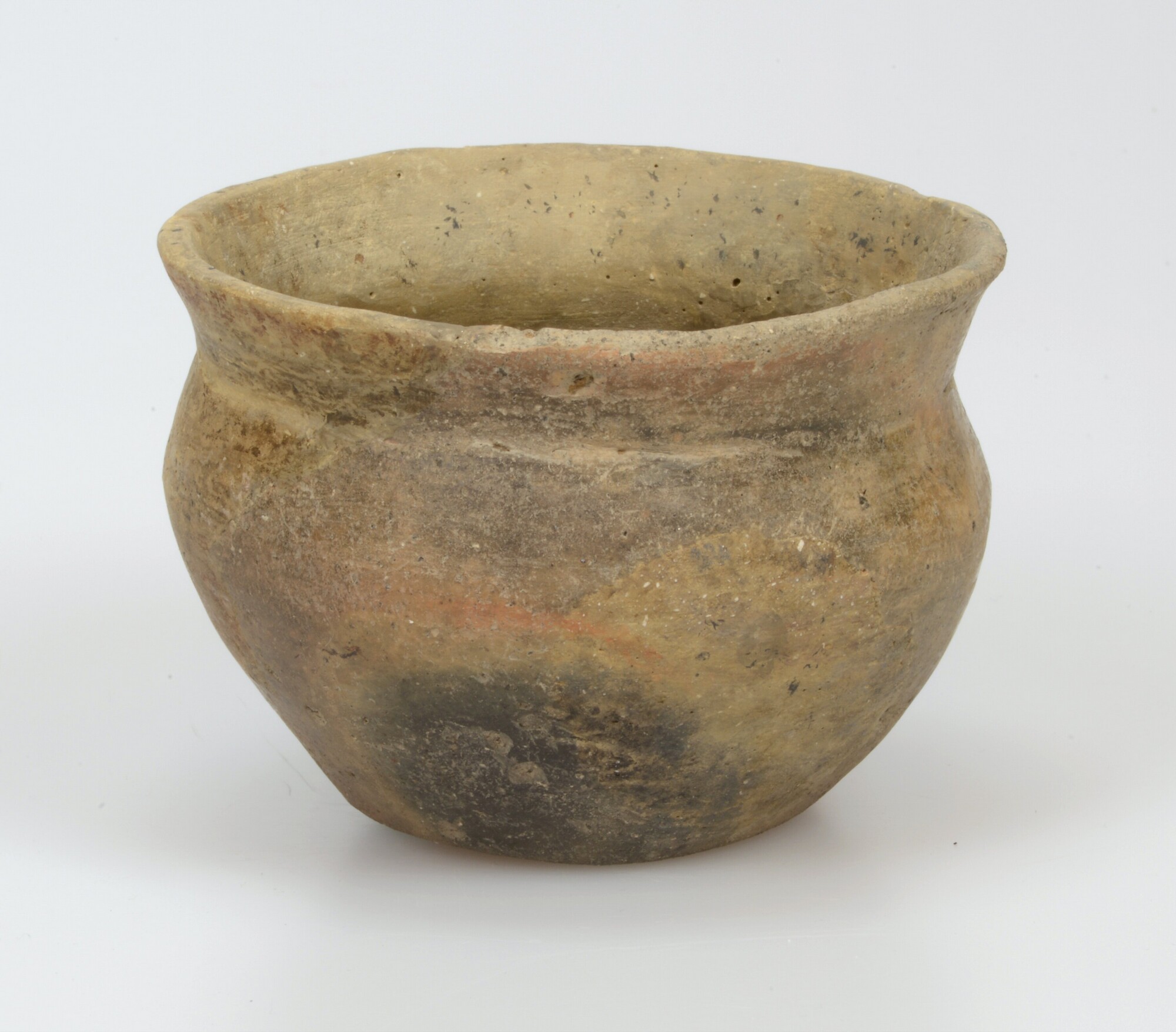 Pot; klein bolvormige potje met korte vloeiende schouder, scherpe hals-buik en uitstaande rand; buitenzijde is gepolijst; steengruismagering; standvlak