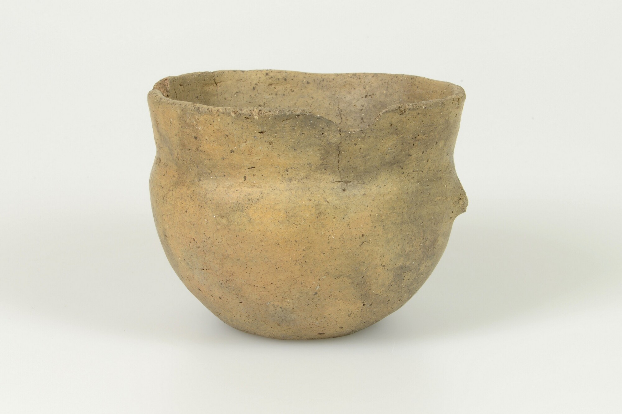 Urn; bolvormige pot met naar buitenstaande rand; standvlak; knobbeloor (afgebroken); fijne granietgruis magering