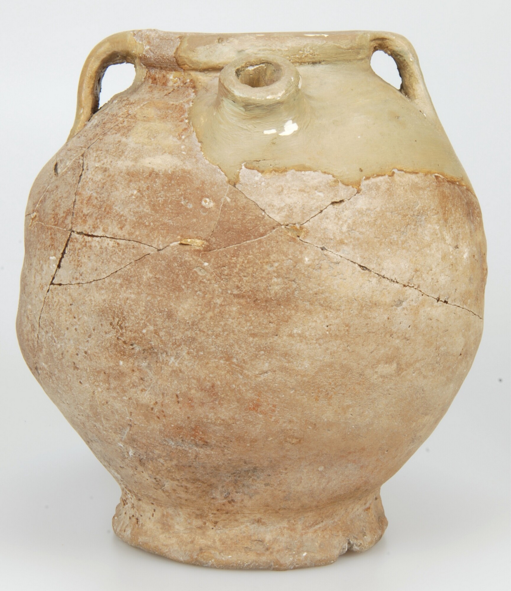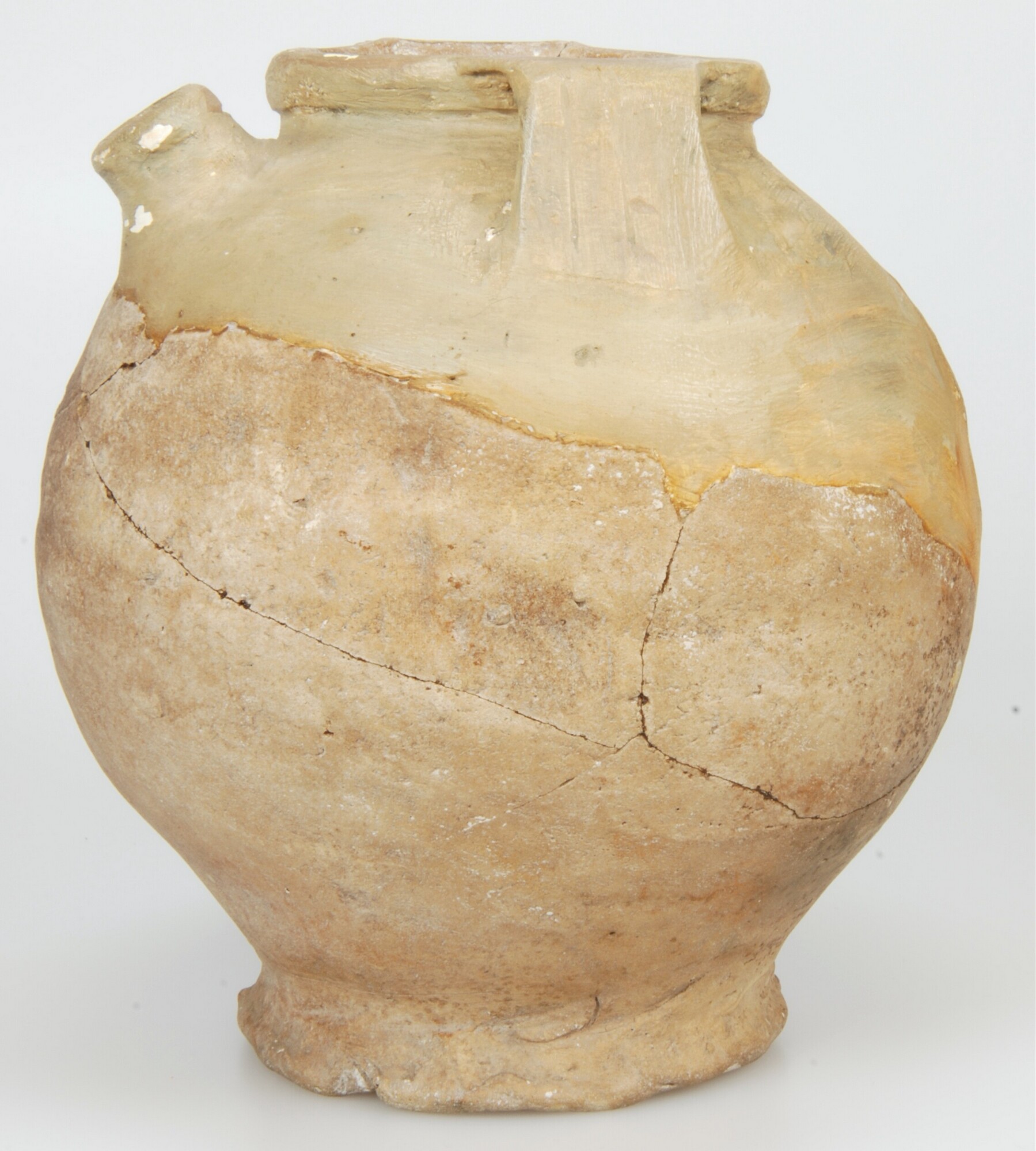 Tuitpot; Pingsdorf aardewerk; lichtgeel baksel met ongeprofileerde rand, twee platte, uit de rand getrokken oren en een uitgeknepen ronde tuit; uitgeknepen standring; Wieringen