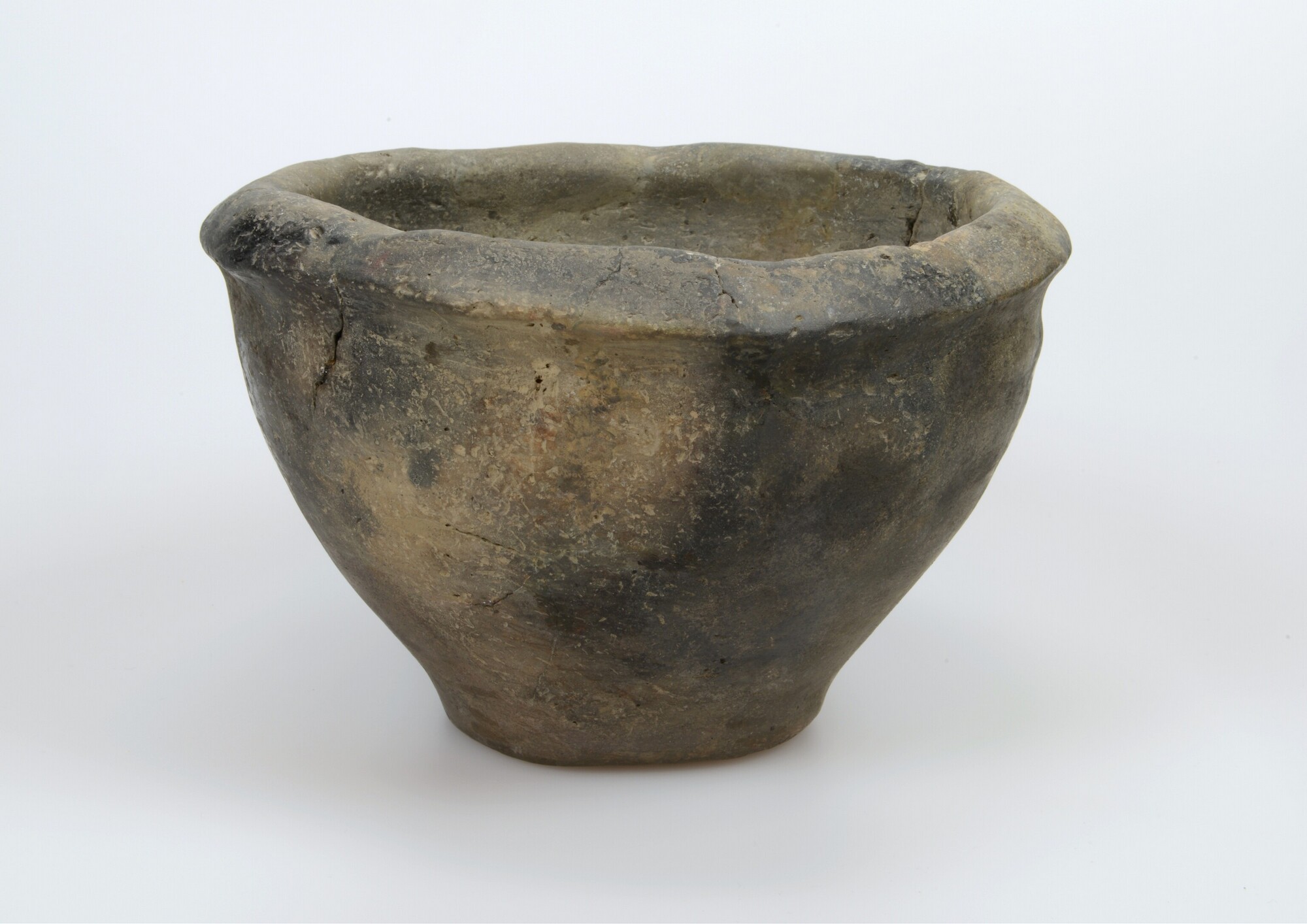 Kom; Diederik type IX (?); inheems-Romeins aardewerk; handgevormd; open van vorm met een gepolijst/geglad zwart oppervlak; standvlak; organische magering