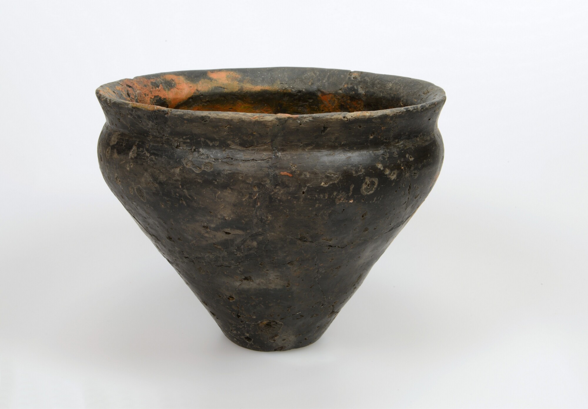 Kelkpot/situla; type Diederik L-IVb; inheems-Romeins aardewerk; korte schouder die rond overloopt in de buik; gepolijst oppervlak; standvoet; oranje aankoeksel aan de binnenzijde