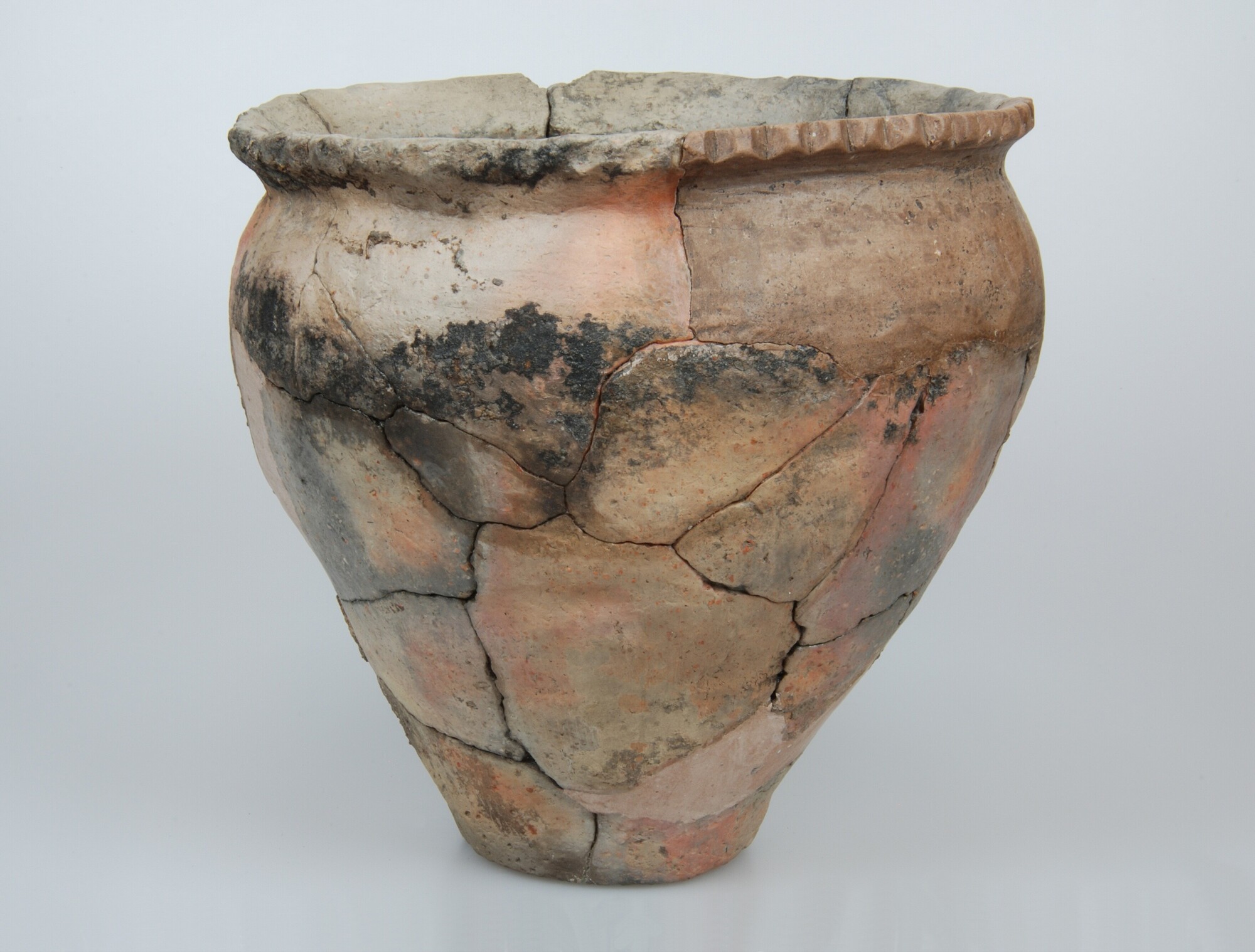 Kookpot; type Diederik F-Ia; inheems-romeins aardewerk; wijdmondige kookpot met versierde kartelrand; besmeten; roetsporen buitenzijde; standvlak; potgruis magering; vondstjaar: 1991, vondstomstandigheden: grote kuil in slibbak gemeente