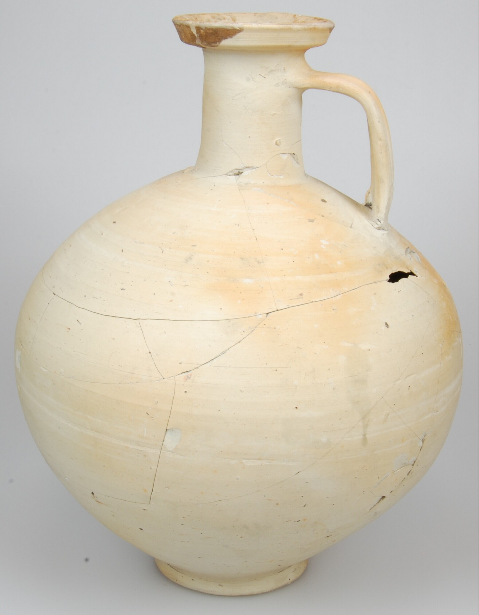 Gladwandige kruik; type hofheim 50; grootste buikomvang ligt op het midden; wijduitstaande rand met restanten hars en een breed oor; standring; geel/wit baksel; vondstomstandigheden: vroege/late waterput 90