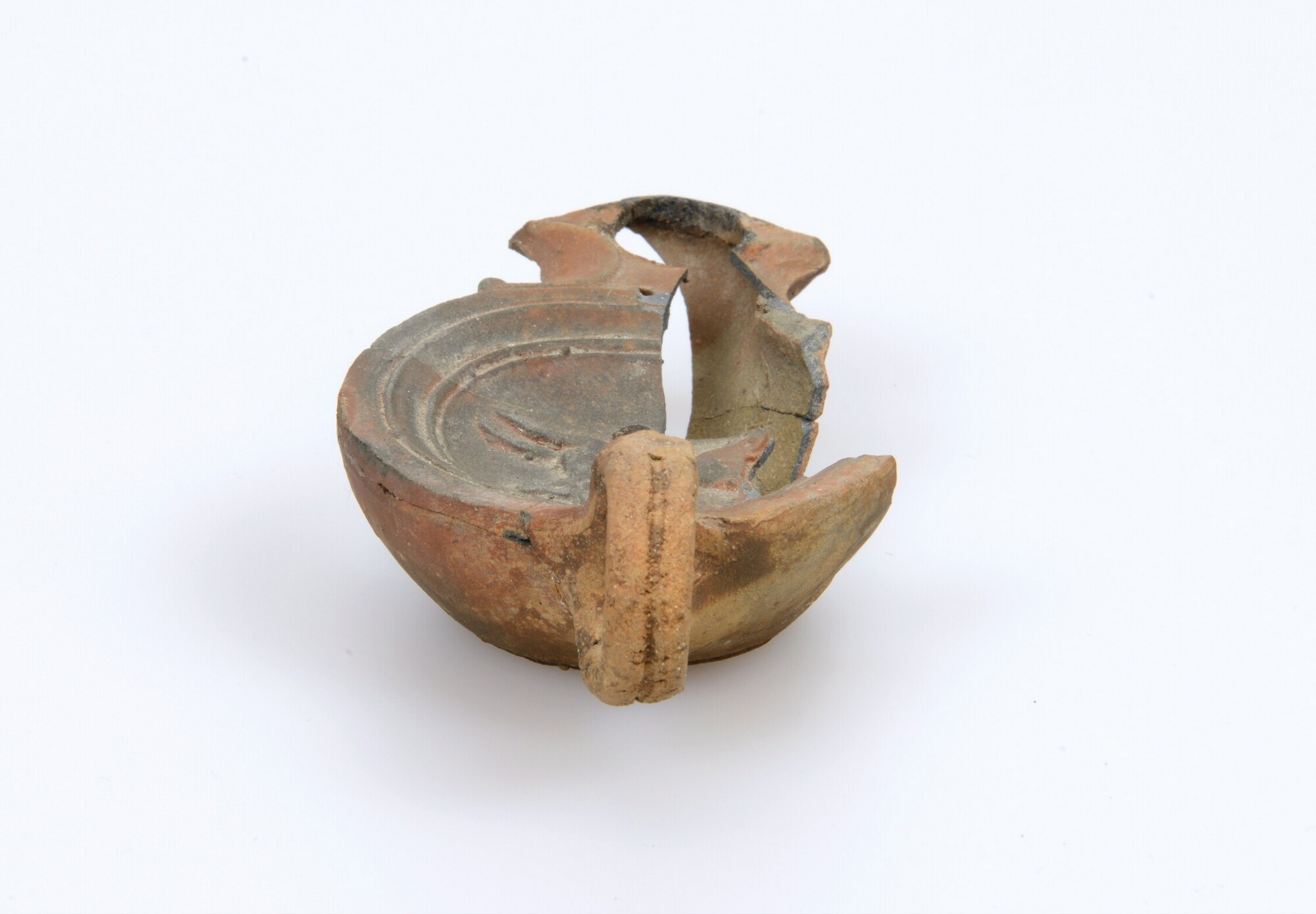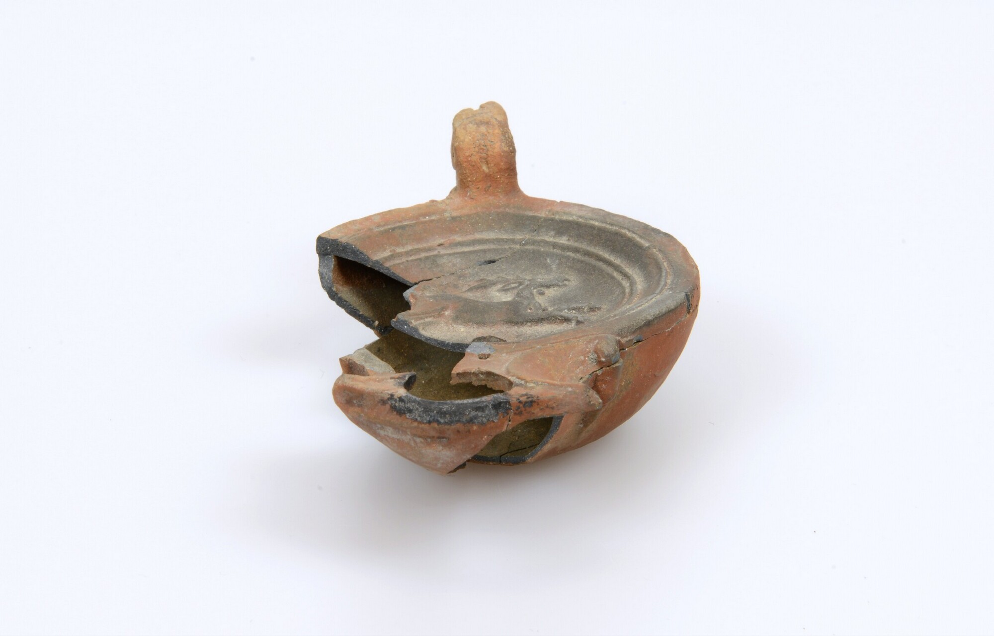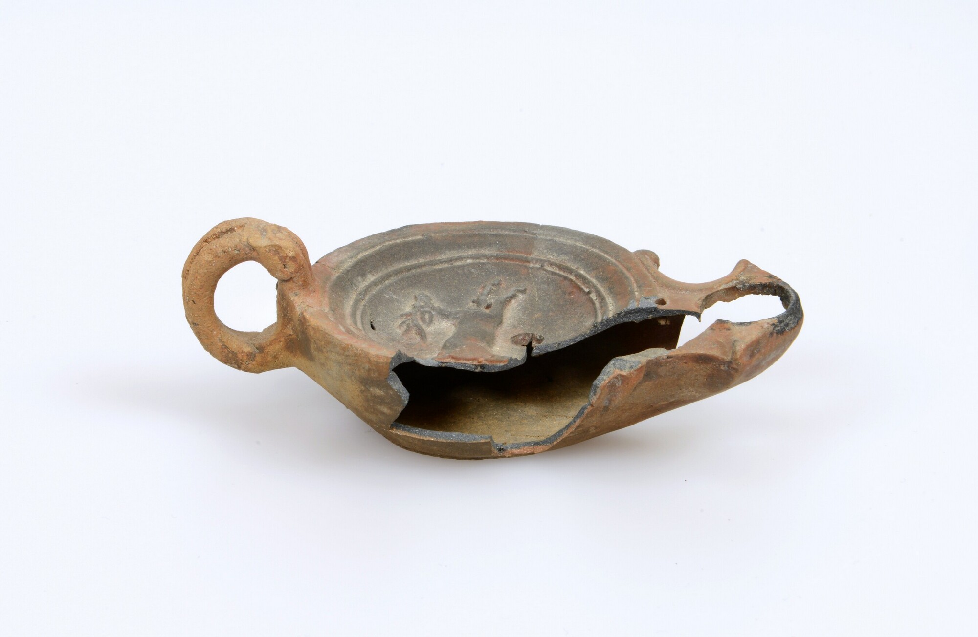 Olielamp; type Loeschcke I (Ha 35); roetsporen op de voluuttuit (driehoekig/rond); aan de achterzijde bevindt zich een rond oor; rondom de spiegel is de schouder van meerdere concentrische groeven voorzien; op de spiegel staat een springend hert afgebeeld; platte bodem; hard grijs/oranje-rode baksel