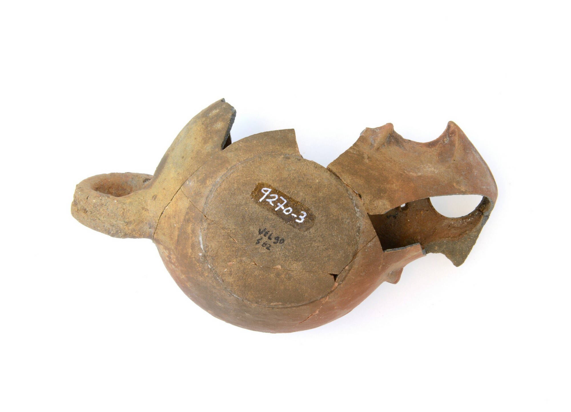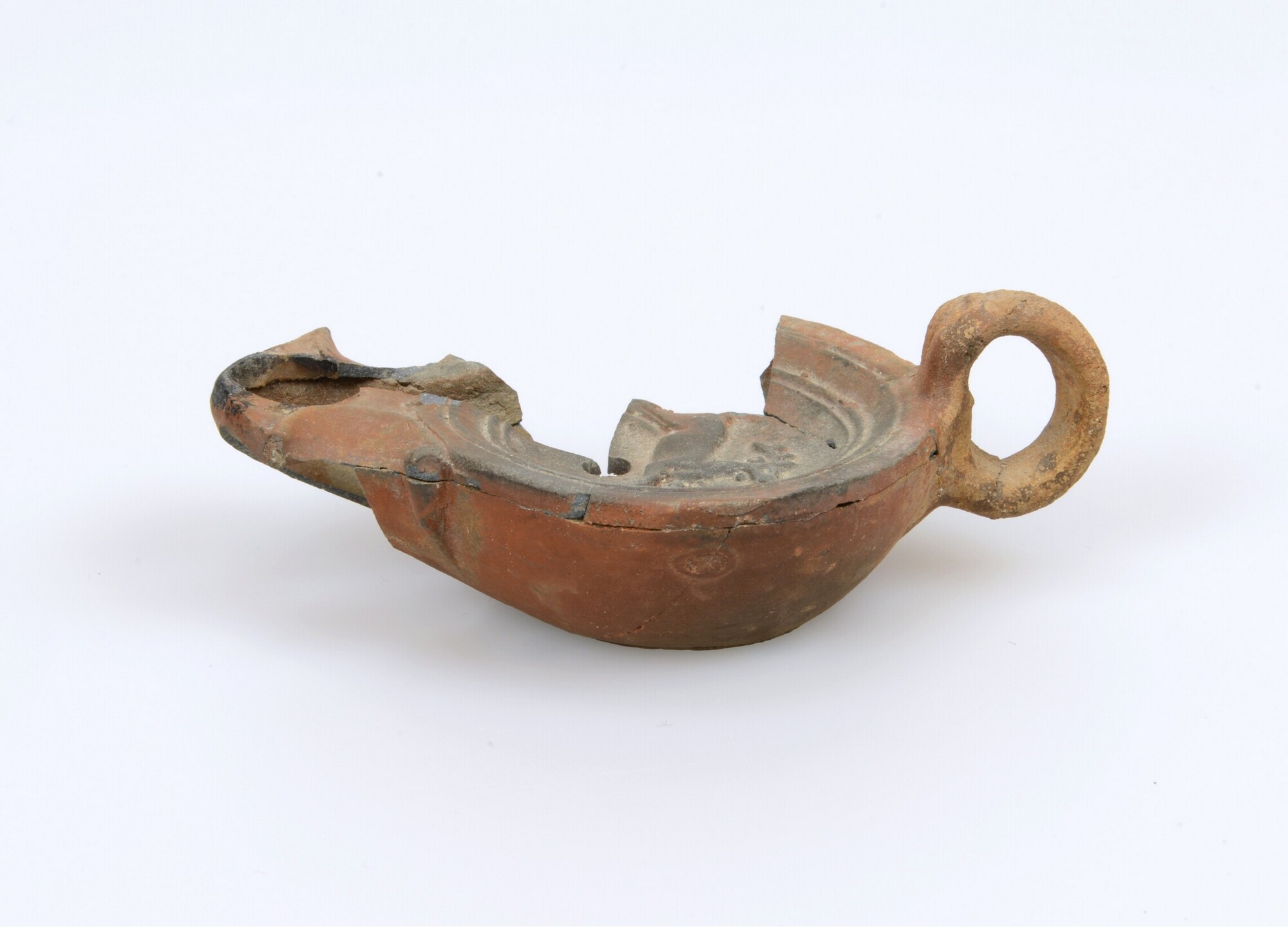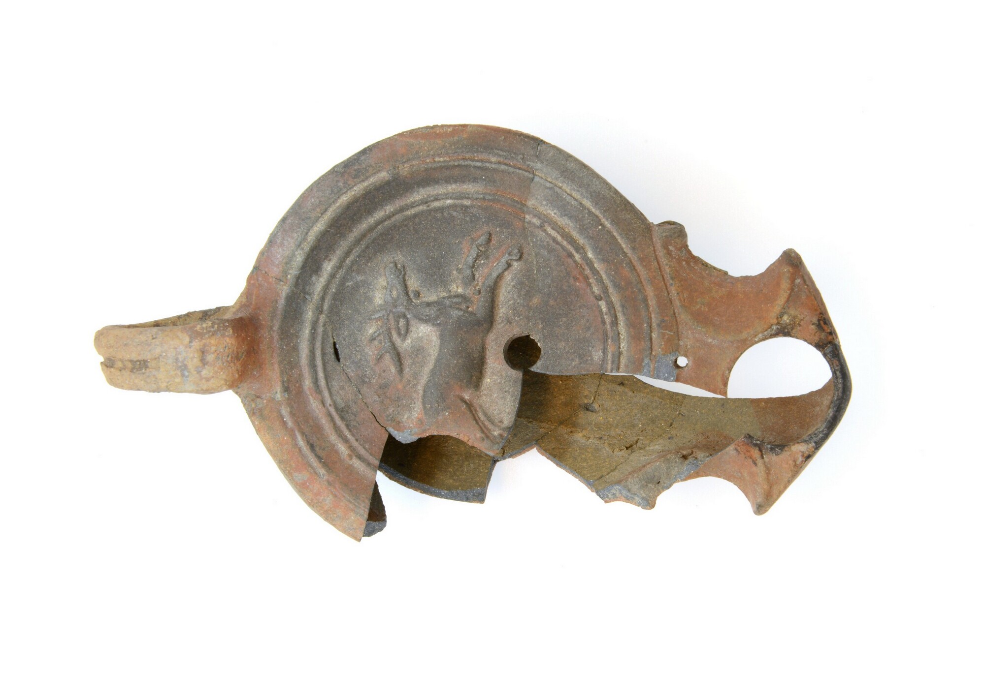 Olielamp; type Loeschcke I (Ha 35); roetsporen op de voluuttuit (driehoekig/rond); aan de achterzijde bevindt zich een rond oor; rondom de spiegel is de schouder van meerdere concentrische groeven voorzien; op de spiegel staat een springend hert afgebeeld; platte bodem; hard grijs/oranje-rode baksel