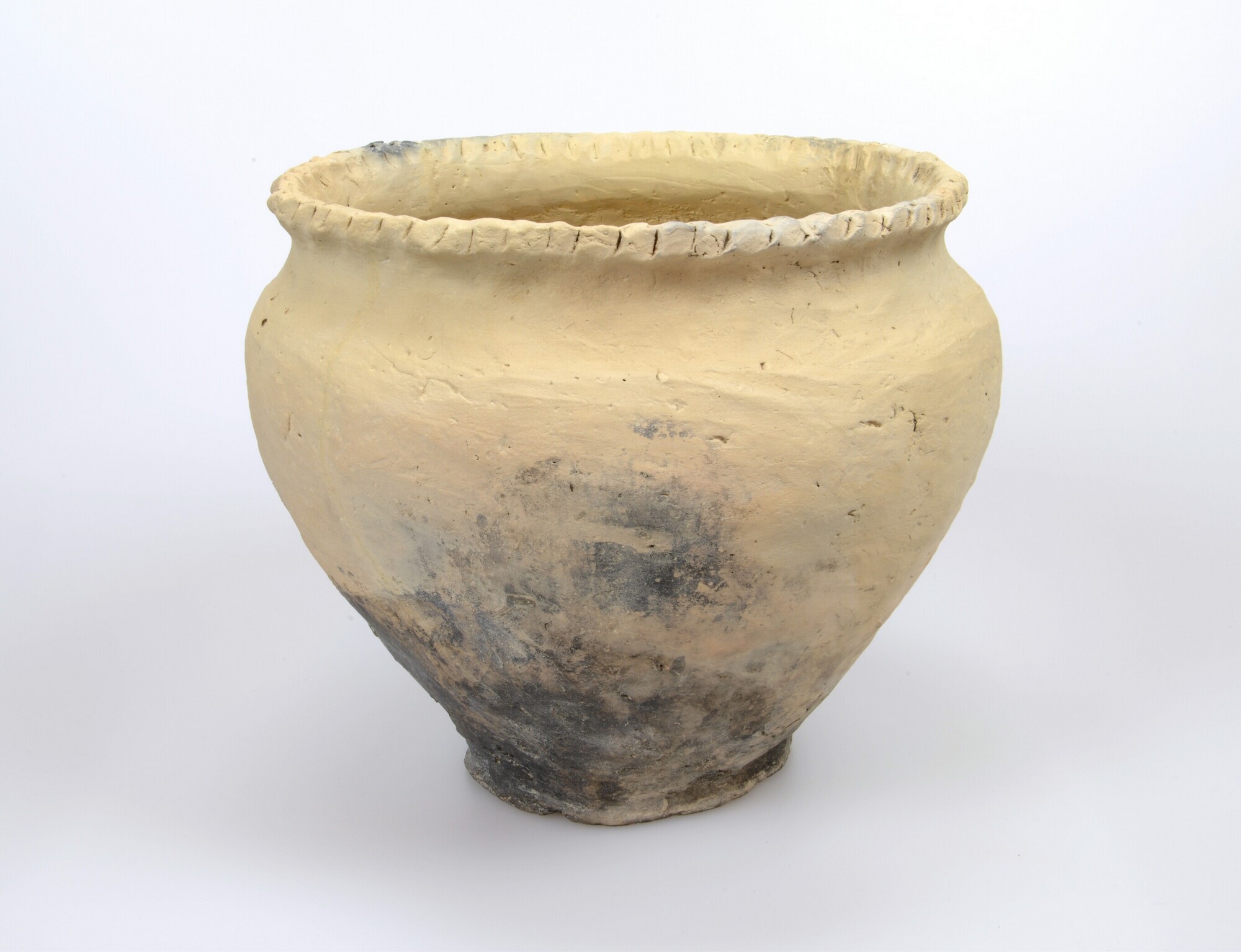 Pot; wijdmondige pot met brede kraagrand waarbij deze is voorzien van twee rijen nagelversiering op binnen- en buitenzijde; standvoet; potgruis magering (?); vondstomstandigheden: met 4 andere potten in één kuil