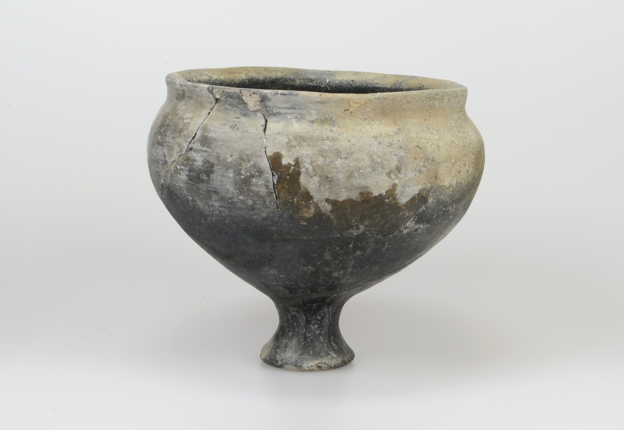 Kelkpot/situla; type Diederik F-V; handgevormd aardewerk; wijdmondige bolle pot op een hoge, uitgeholde standvoet; vrijwel even hoog als breed type met meervoudige gefacetteerde A-rand; potnr.: 18-6