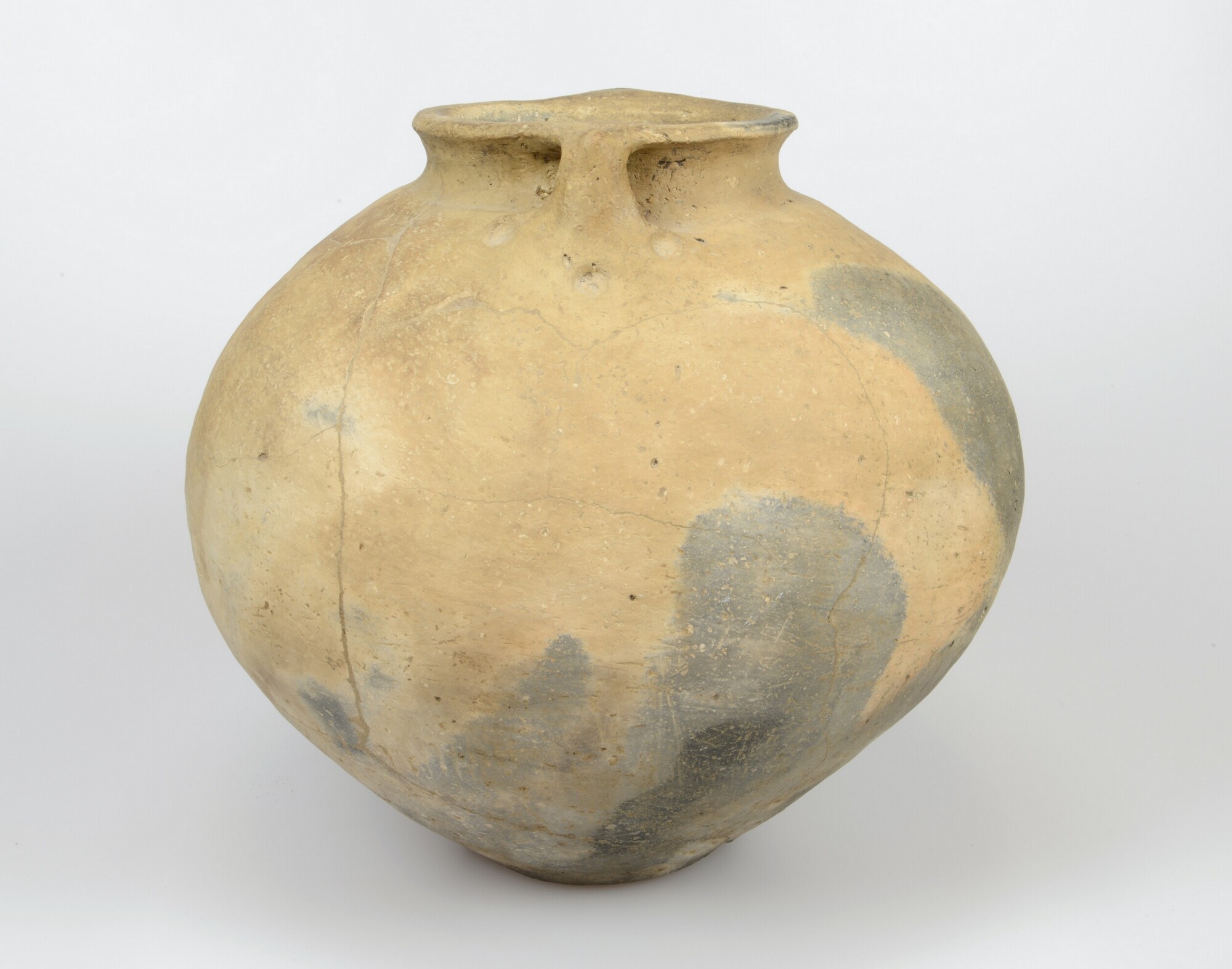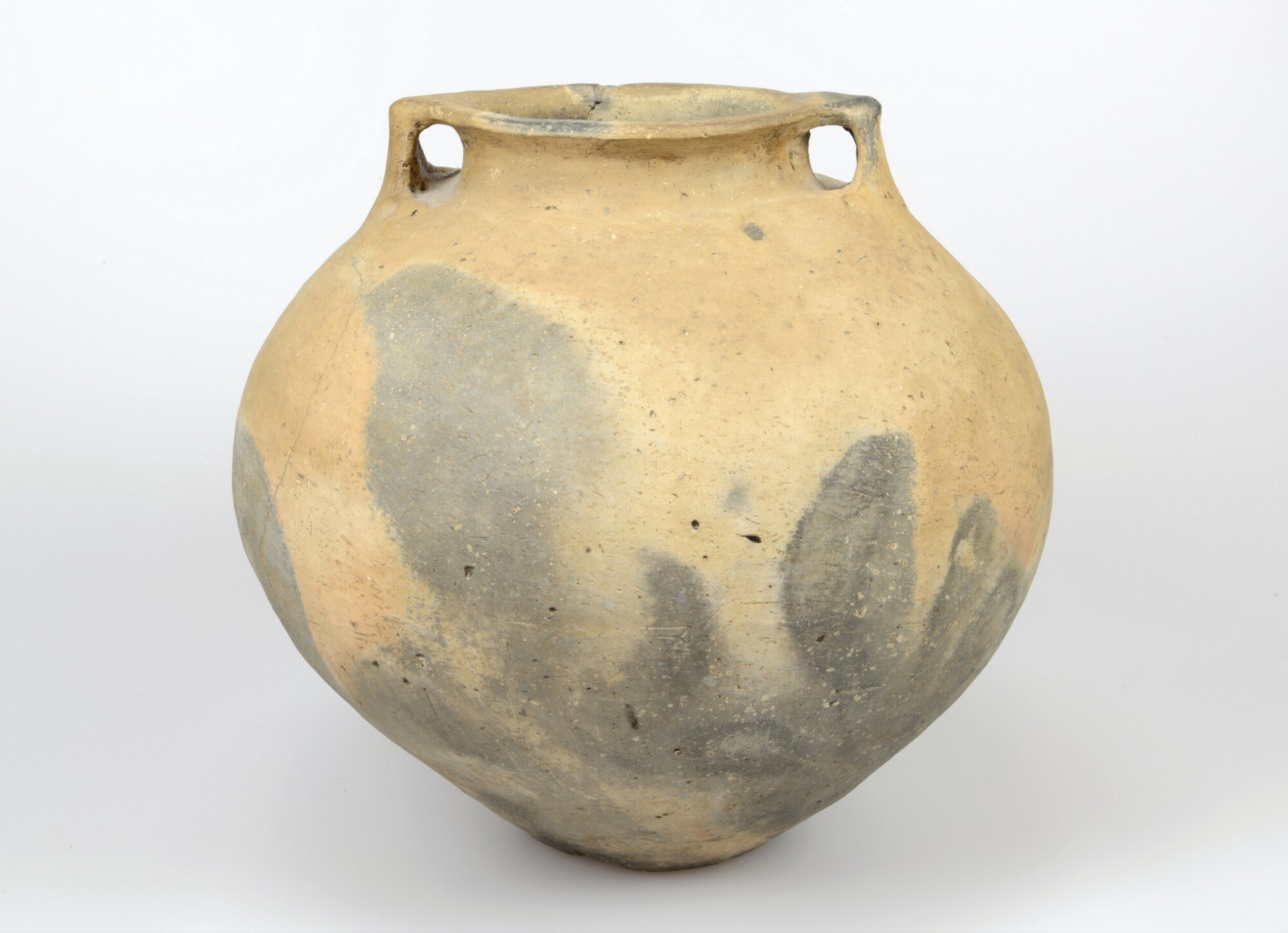 Pot; type Westergo Ge5b; nauwmondige bolvormige pot met oren aan de rand en rondom de oren zijn op gelijke afstand van elkaar drie vingerindrukken ter versiering aangebracht; standvlak; organische magering