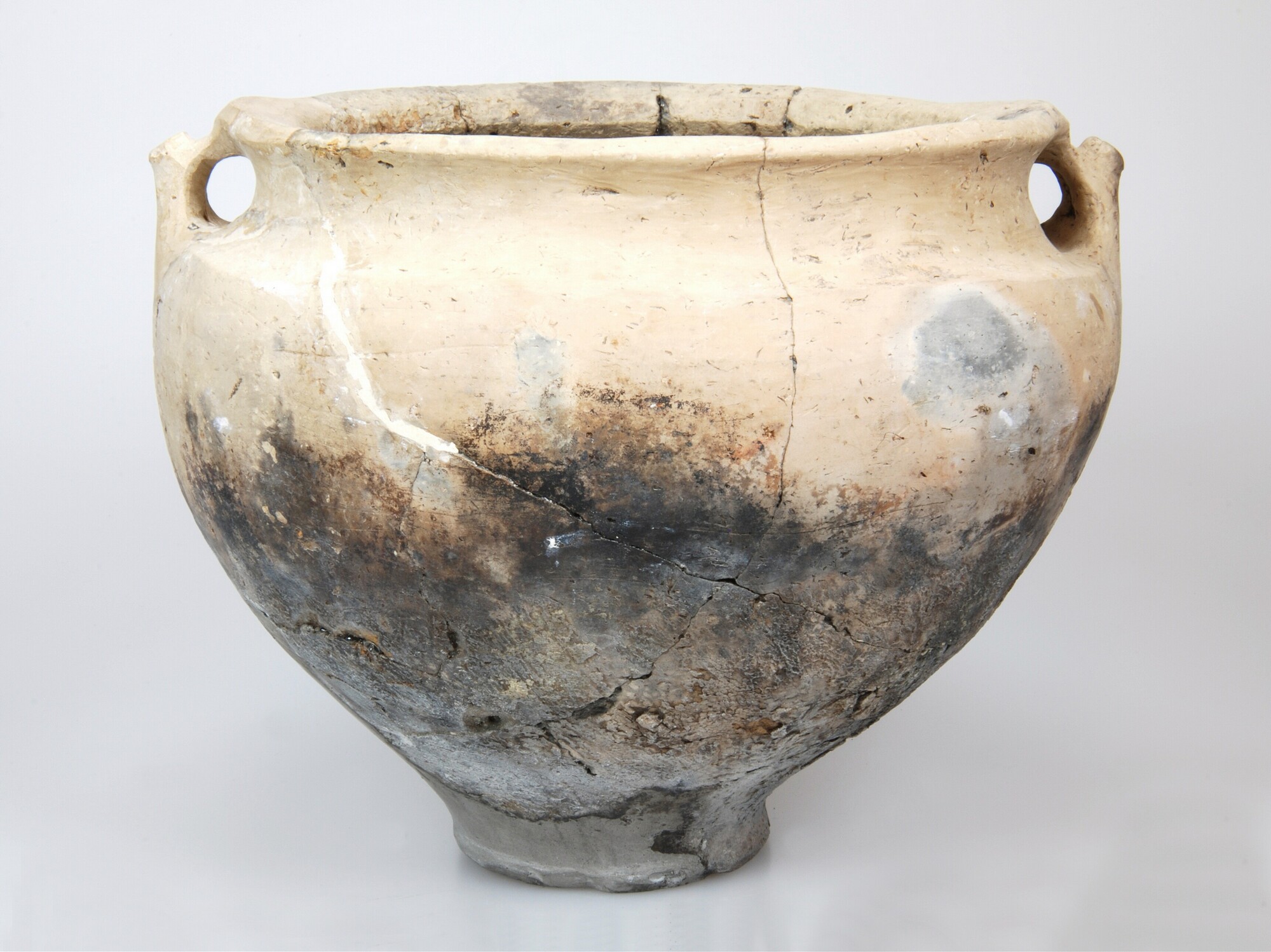 Pot; type Diederik F-II; wijdmondige lage pot met twee oren aan de rand en breder dan dat deze hoog is; onderzijde besmeten en bovenzijde geglad; standvoet; potgruis/organische magering