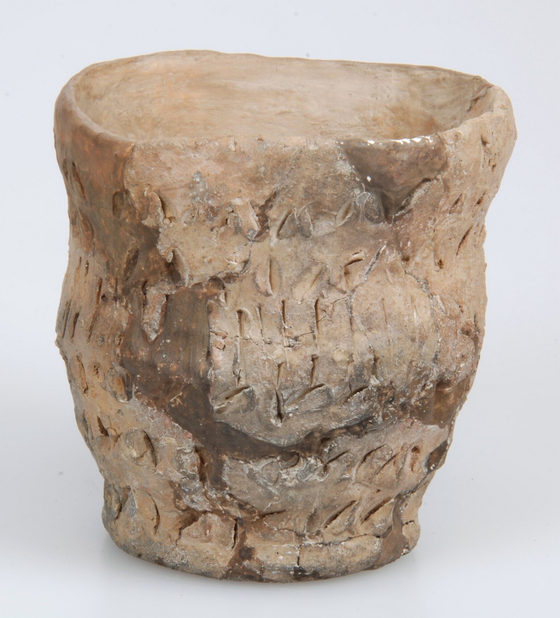 Miniatuur potbeker; aardewerk; gezoneerde vingernagelindruk versiering; standvoet